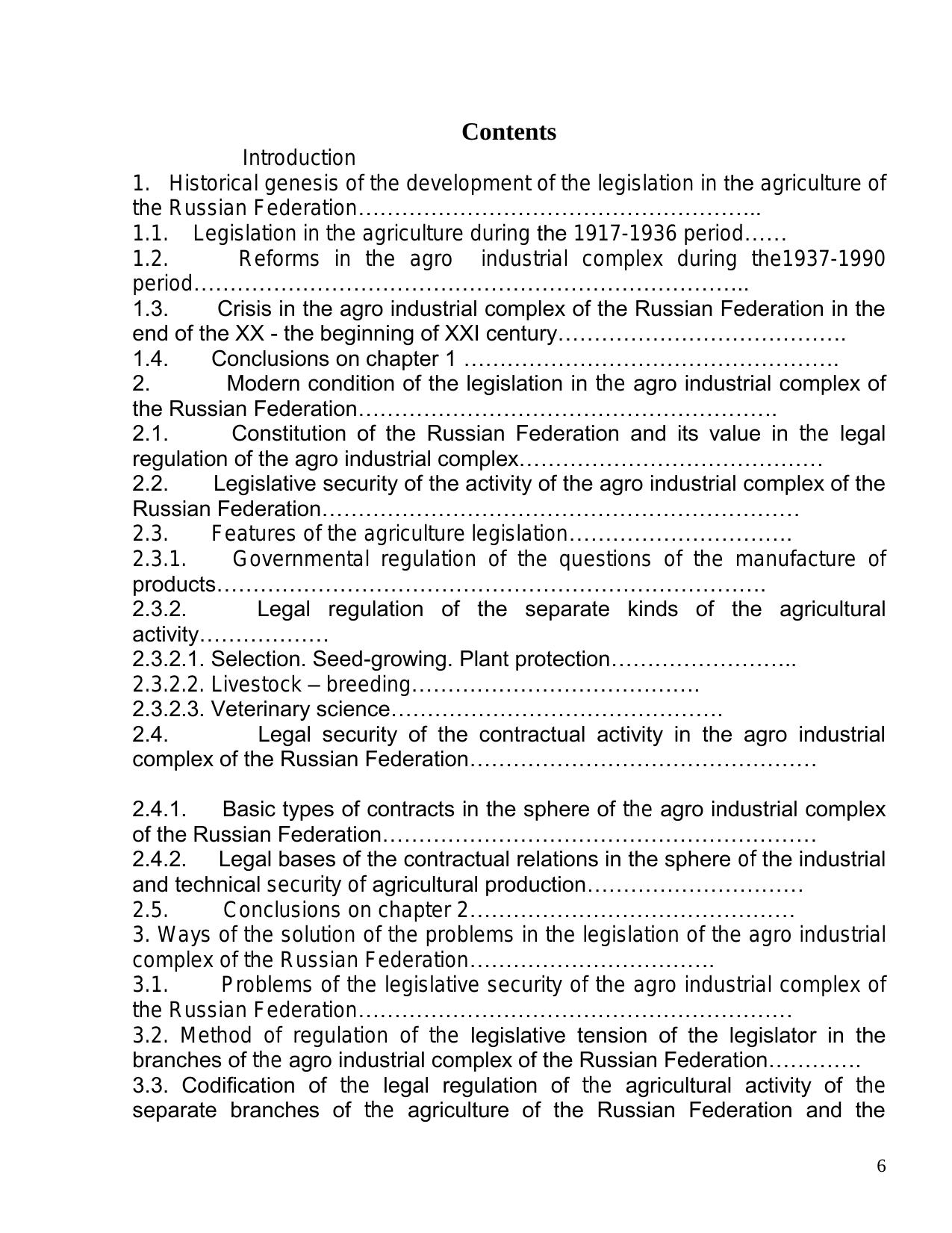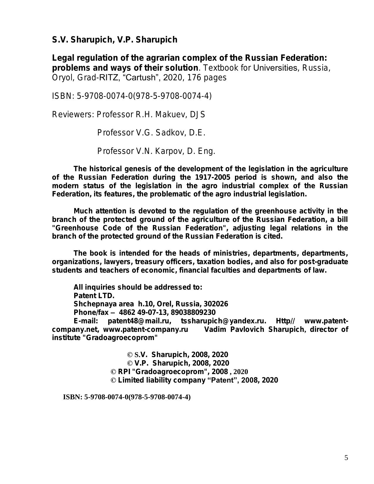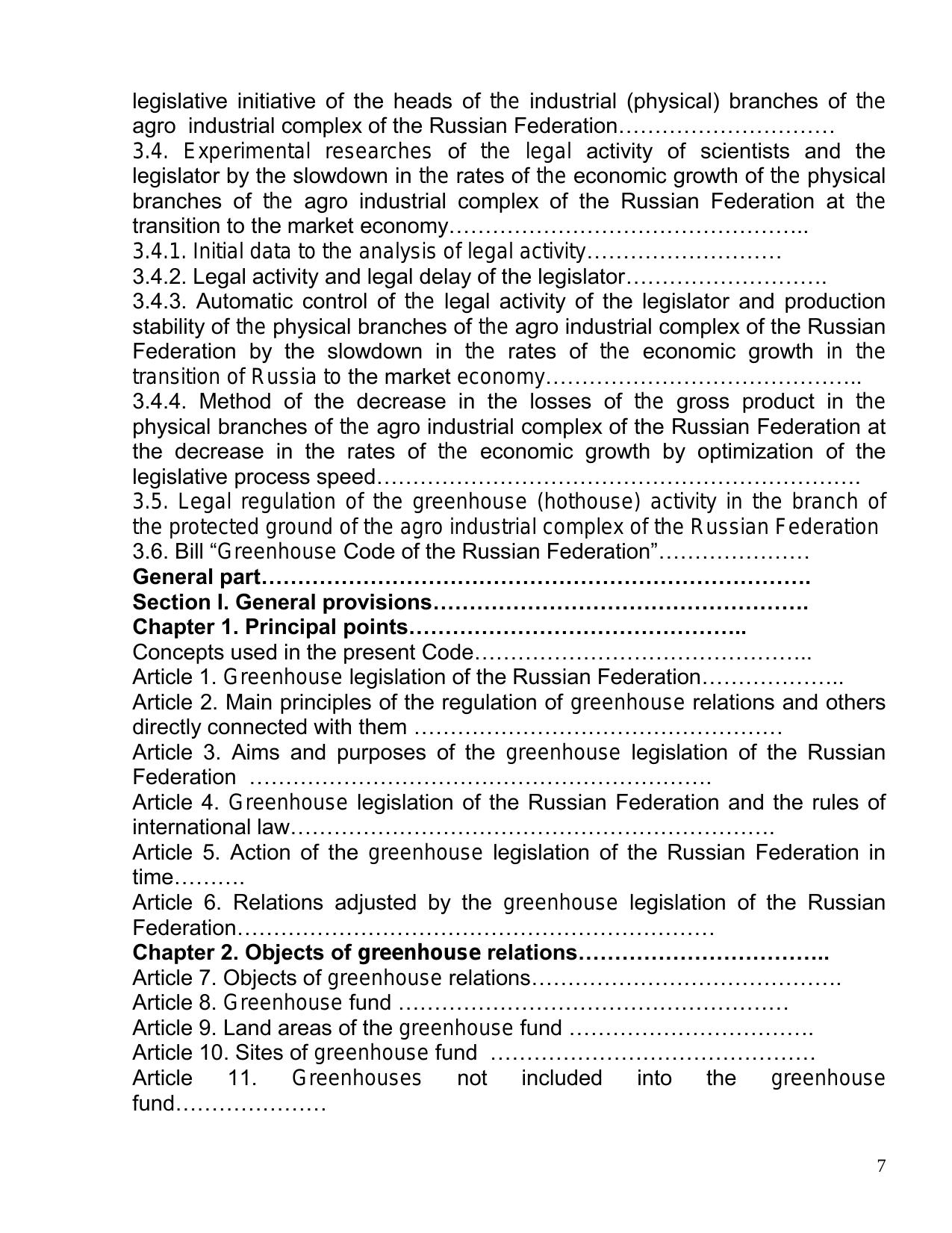 The historical genesis of the development of the legislation in the agriculture of the Russian Federation during the 1917-2005 period is shown, and also the modern status of the legislation in the agro industrial complex of the Russian Federation, its features, the problematic of the agro industrial legislation. Much attention is devoted to the regulation of the greenhouse activity in the branch of the protected ground of the agriculture of the Russian Federation, a bill "Greenhouse Code of the Russian Federation", adjusting legal relations in the branch of the protected ground of the Russian Federation is cited.