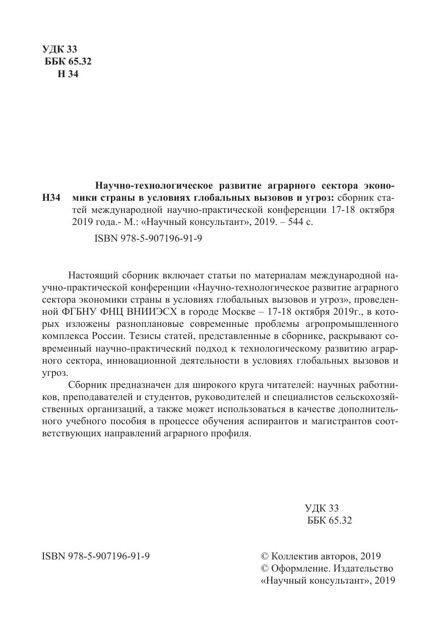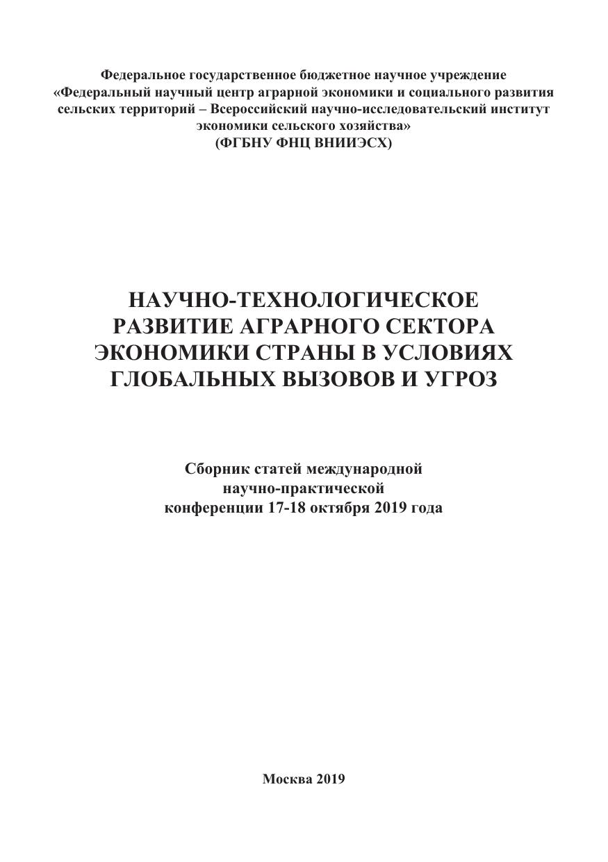 Сборник научных трудов. Настоящий сборник включает статьи по материалам международной научно-практической конференции «Научно-технологическое развитие аграрного сектора экономики страны в условиях глобальных вузов и угроз», проведенной ФГБНУ ФНЦ ВНИИЭСХ в городе Москве – 17-18 октября 2019г., в которых изожжены разноплановые современные проблемы агропромышленного комплекса России. Тезисы статей, представленные в сборнике, раскрывают современный научно-практический подход к технологическому развитию аграрного сектора, инновационной деятельности в условиях глобальных вызовов и угроз.