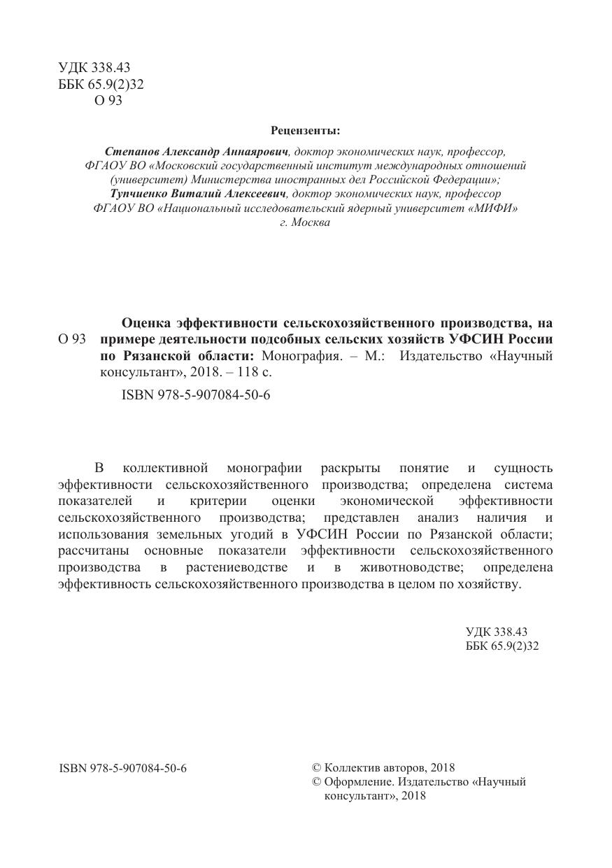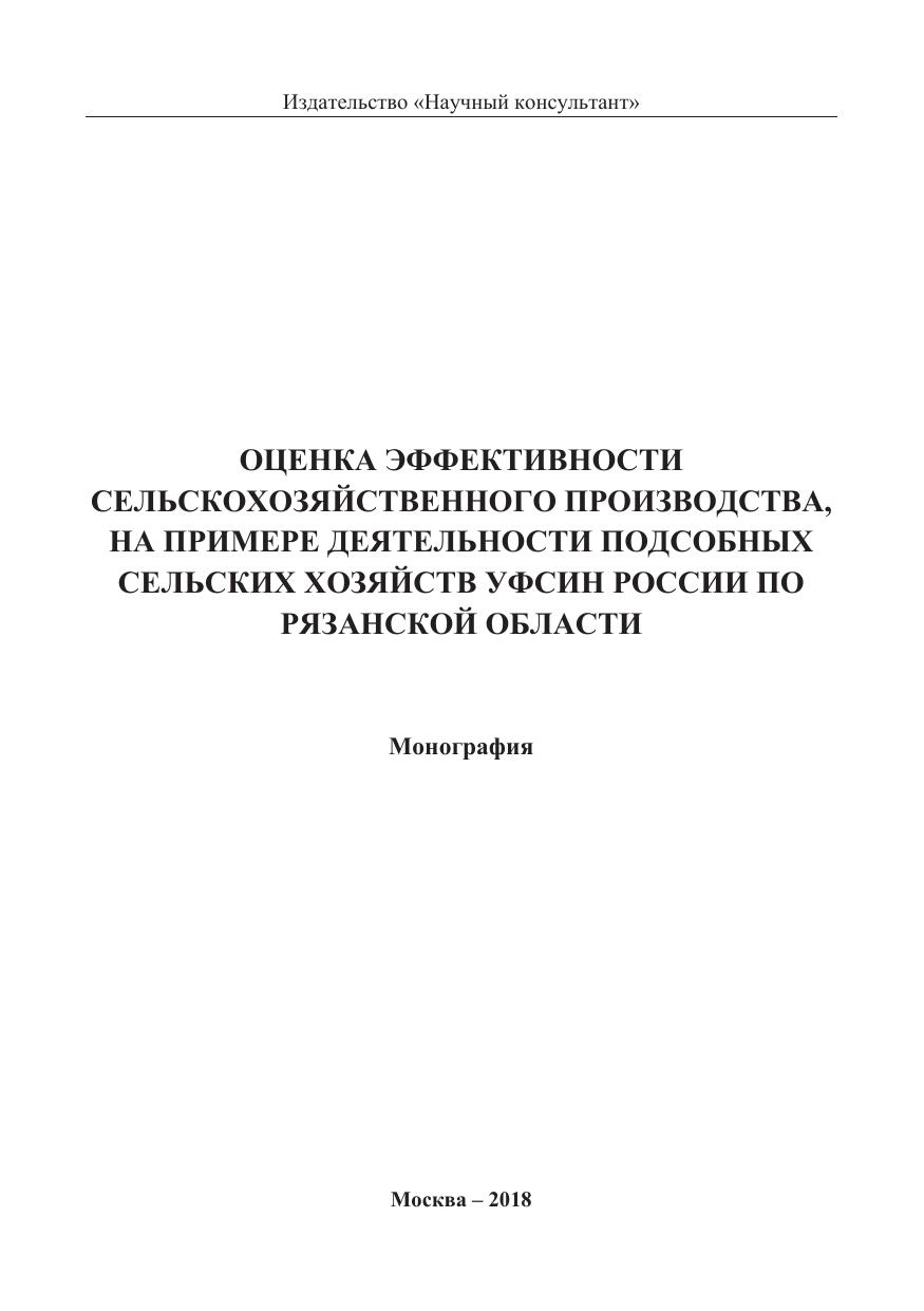 В коллективной монографии раскрыты понятие и сущность эффективности сельскохозяйственного производства; определена система показателей и критерии оценки экономической эффективности сельскохозяйственного производства; представлен анализ наличия и использования земельных угодий в УФСИН России по Рязанской области; рассчитаны основные показатели эффективности сельскохозяйственного производства в растениеводстве и в животноводстве; определена эффективность сельскохозяйственного производства в целом по хозяйству