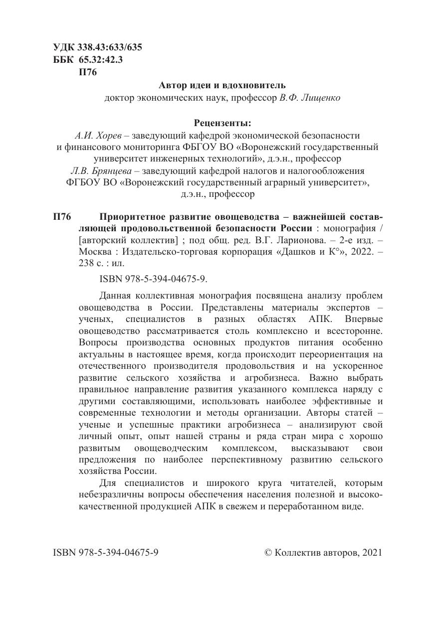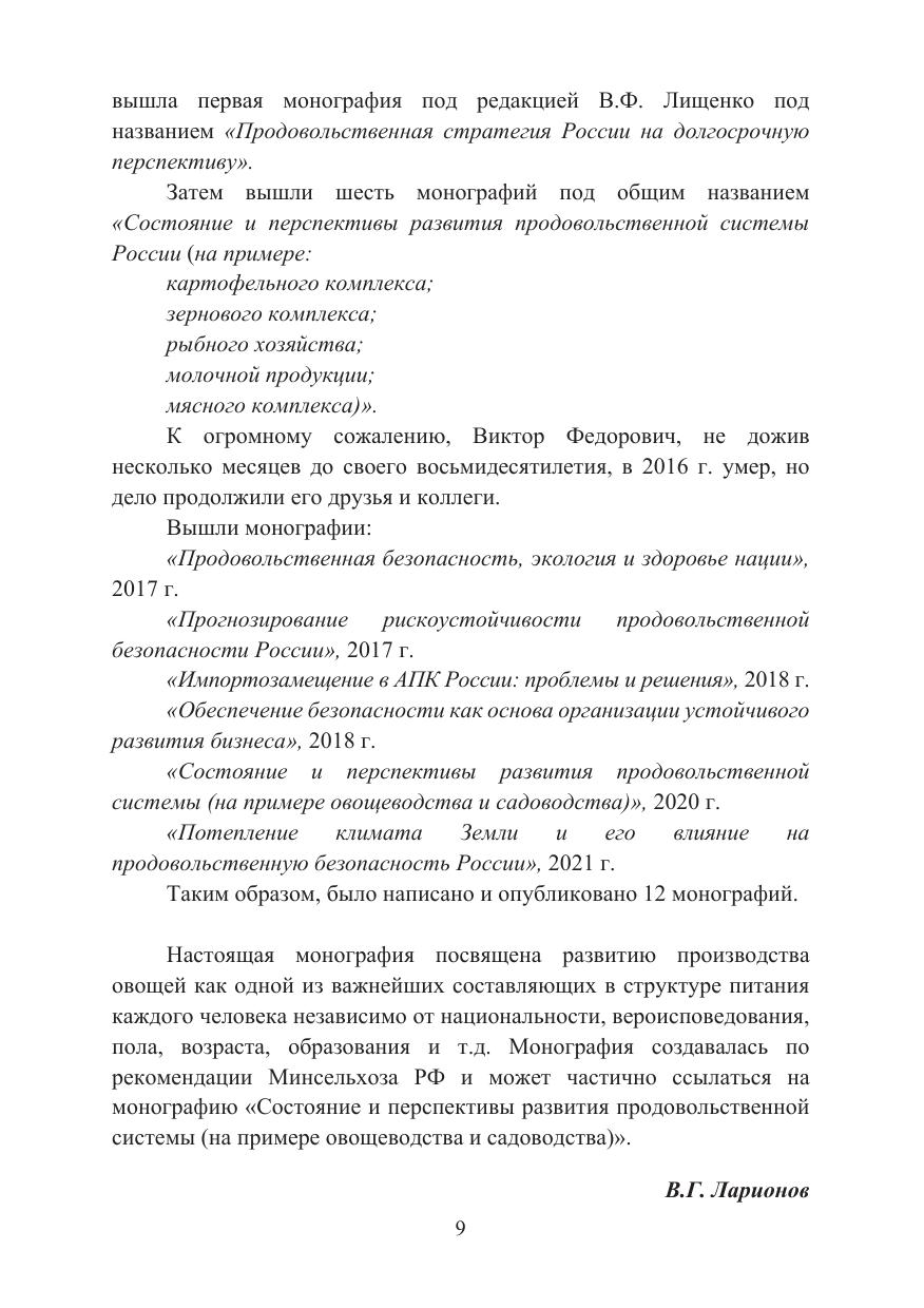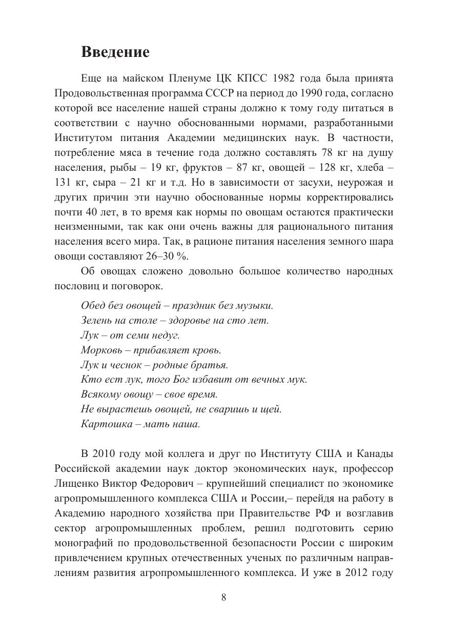 Данная коллективная монография посвящена анализу проблем овощеводства в России. Представлены материалы экспертов – ученых, специалистов в разных областях АПК. Впервые овощеводство рассматривается столь комплексно и всесторонне. Вопросы производства основных продуктов питания особенно актуальны в настоящее время, когда происходит переориентация на отечественного производителя продовольствия и на ускоренное развитие сельского хозяйства и агробизнеса. Важно выбрать правильное направление развития указанного комплекса наряду с другими составляющими, использовать наиболее эффективные и современные технологии и методы организации. Авторы статей – ученые и успешные практики агробизнеса – анализируют свой личный опыт, опыт нашей страны и ряда стран мира с хорошо развитым овощеводческим комплексом, высказывают свои предложения по наиболее перспективному развитию сельского хозяйства России.