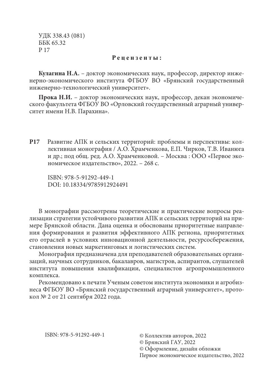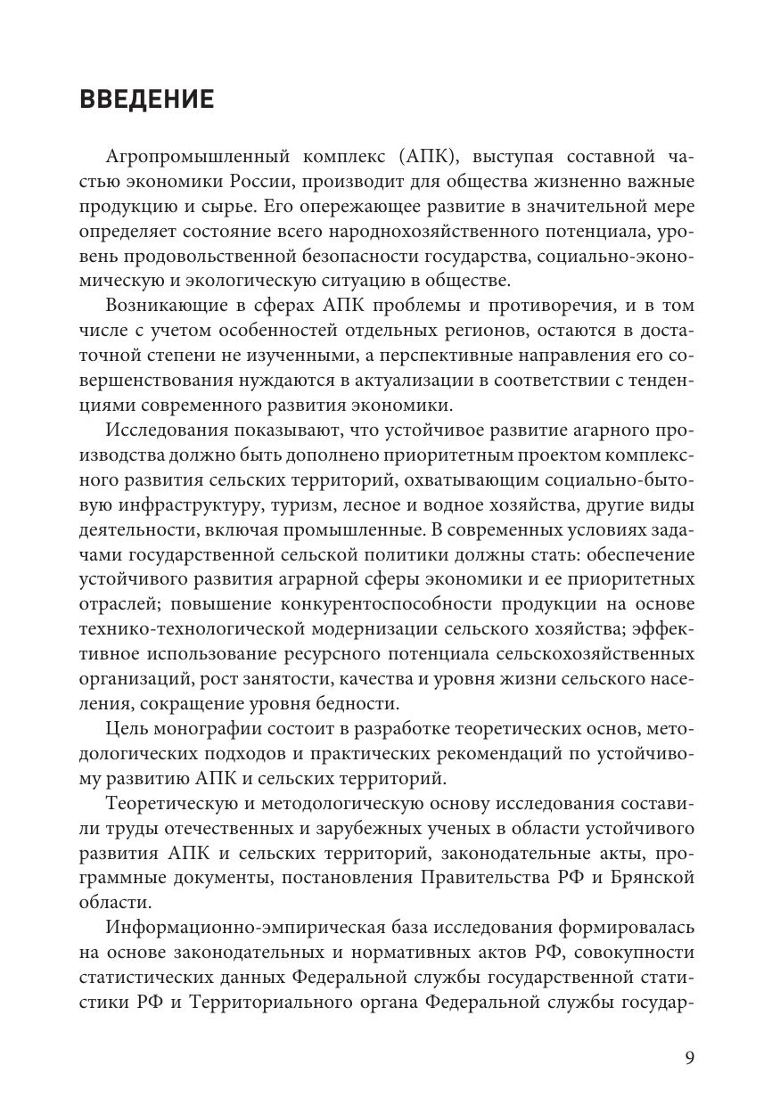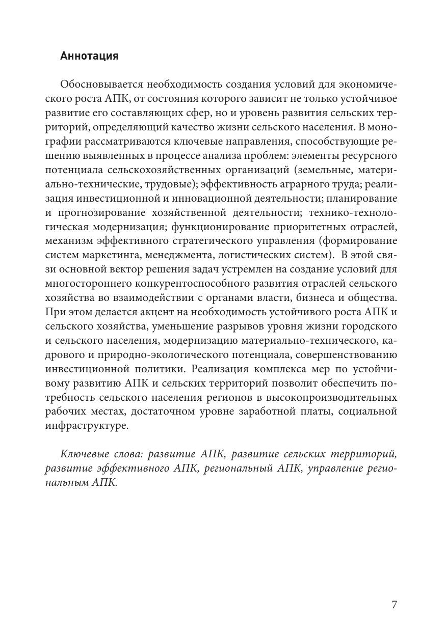 Обосновывается необходимость создания условий для экономического роста АПК, от состояния которого зависит не только устойчивое развитие его составляющих сфер, но и уровень развития сельских территорий, определяющий качество жизни сельского населения. В монографии рассматриваются ключевые направления, способствующие решению выявленных в процессе анализа проблем: элементы ресурсного потенциала сельскохозяйственных организаций (земельные, материально-технические, трудовые); эффективность аграрного труда; реализация инвестиционной и инновационной деятельности; планирование и прогнозирование хозяйственной деятельности; технико-технологическая модернизация; функционирование приоритетных отраслей, механизм эффективного стратегического управления (формирование систем маркетинга, менеджмента, логистических систем). В этой связи основной вектор решения задач устремлен на создание условий для многостороннего конкурентоспособного развития отраслей сельского хозяйства во взаимодействии с органами власти, бизнеса и общества. При этом делается акцент на необходимость устойчивого роста АПК и сельского хозяйства, уменьшение разрывов уровня жизни городского и сельского населения, модернизацию материально технического, кадрового и природно-экологического потенциала, совершенствованию инвестиционной политики. Реализация комплекса мер по устойчивому развитию АПК и сельских территорий позволит обеспечить потребность сельского населения регионов в высокопроизводительных рабочих местах, достаточном уровне заработной платы, социальной инфраструктуре.