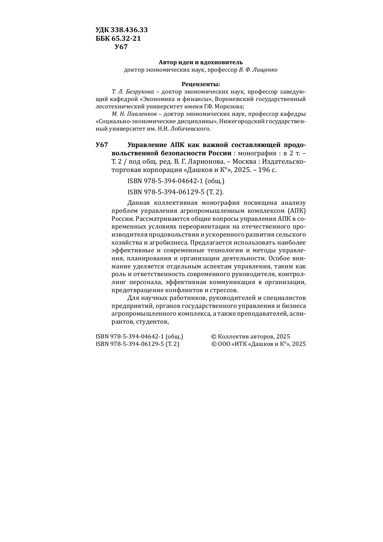 Управление АПК как важной составляющей продовольственной безопасности России. В двух томах. Том 2