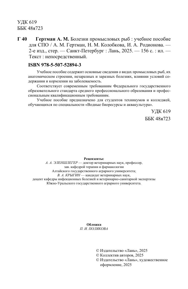 Учебное пособие содержит основные сведения о видах промысловых рыб, их анатомическом строении, незаразных и заразных болезнях, влиянии условий содержания и кормления на заболеваемость. Соответствует современным требованиям Федерального государственного образовательного стандарта среднего профессионального образования и профессиональным квалификационным требованиям. Учебное пособие предназначено для студентов техникумов и колледжей, обучающихся по специальности «Водные биоресурсы и аквакультура».
