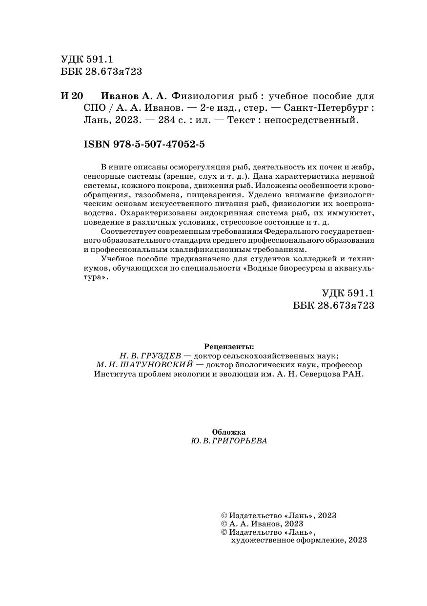 В книге описаны осморегуляция рыб, деятельность их почек и жабр, сенсорные системы (зрение, слух и т. д.). Дана характеристика нервной системы, кожного покрова, движения рыб. Изложены особенности кровообращения, газообмена, пищеварения. Уделено внимание физиологическим основам искусственного питания рыб, физиологии их воспроизводства. Охарактеризованы эндокринная система рыб, их иммунитет, поведение в различных условиях, стрессовое состояние и т. д. Соответствует современным требованиям Федерального государственного образовательного стандарта среднего профессионального образования и профессиональным квалификационным требованиям. Учебное пособие предназначено для студентов колледжей и техникумов, обучающихся по специальности «Водные биоресурсы и аквакультура».