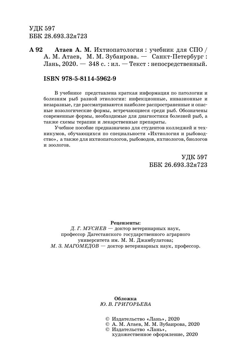 Учебное пособие предназначено для студентов колледжей и техникумов, обучающихся по специальности «Ихтиология и рыбоводство», а также для ихтиопатологов, рыбоводов, ихтиологов, биологов и зоологов.