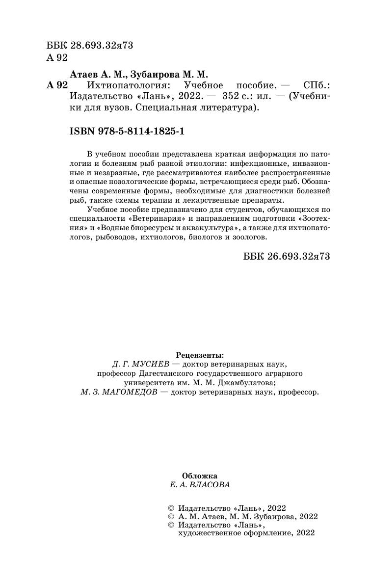 В учебном пособии представлена краткая информация по патологии и болезням рыб разной этиологии: инфекционные, инвазионные и незаразные, где рассматриваются наиболее распространенные и опасные нозологические формы, встречающиеся среди рыб. Обозначены современные формы, необходимые для диагностики болезней рыб, также схемы терапии и лекарственные препараты. Учебное пособие предназначено для студентов обучающихся по специальности «Ветеринария» и направлениям подготовки «Зоотехния» и «Водные биоресурсы и аквакультура», а также для ихтиопатологов, рыбоводов, ихтиологов, биологов и зоологов.
