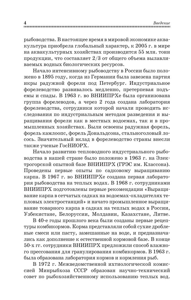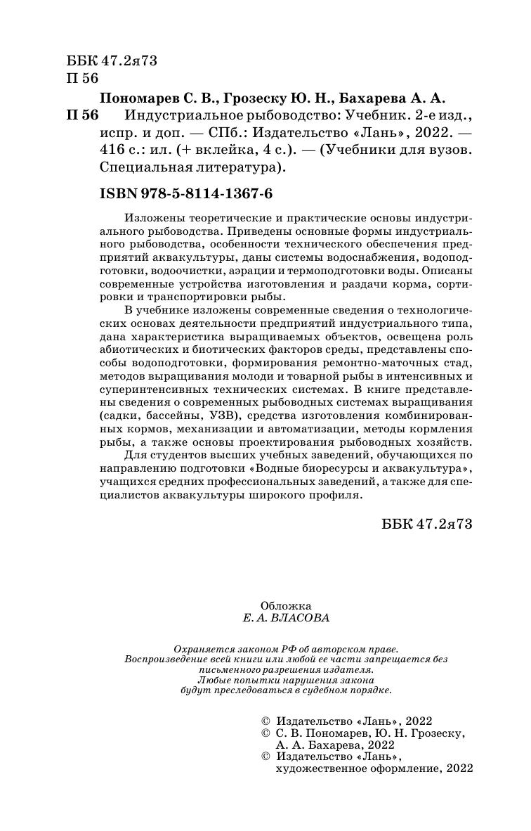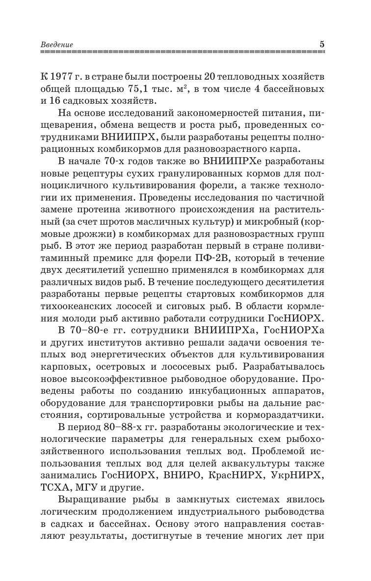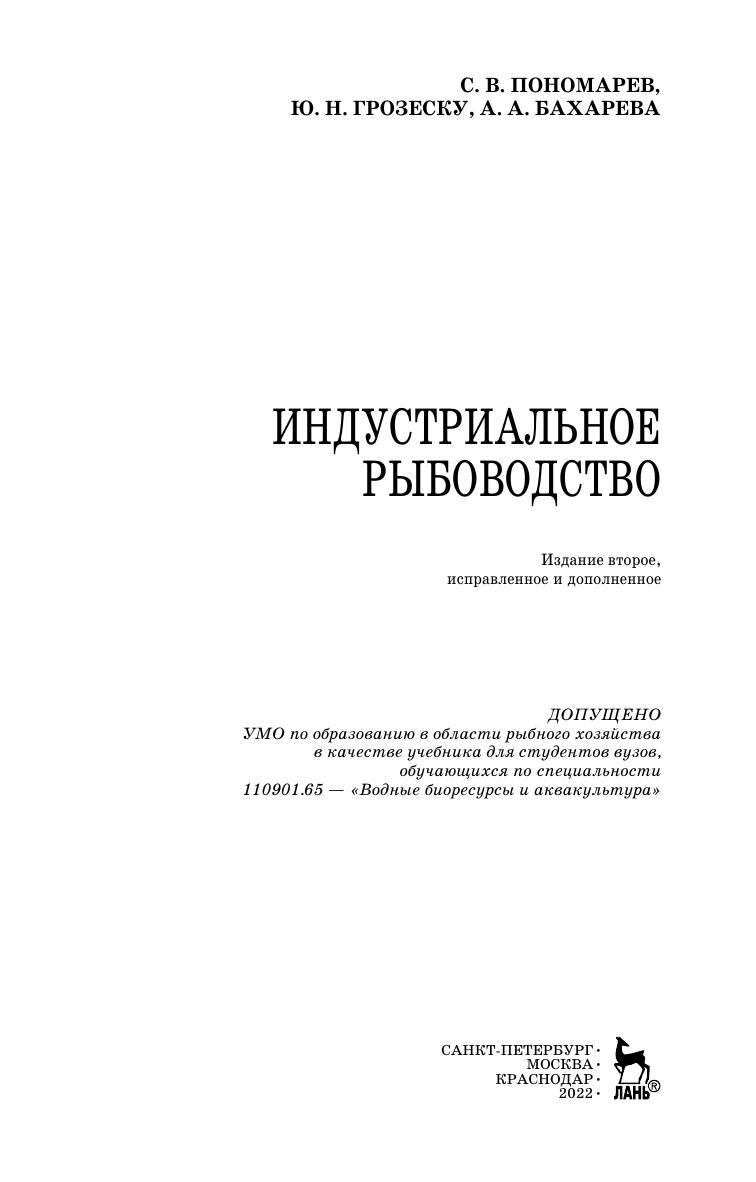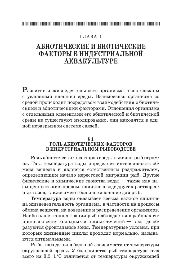 Изложены теоретические и практические основы индустриального рыбоводства. Приведены основные формы индустриального рыбоводства, особенности технического обеспечения предприятий аквакультуры, даны системы водоснабжения, водоподготовки, водоочистки, аэрации и термоподготовки воды. Описаны современные устройства изготовления и раздачи корма, сортировки и транспортировки рыбы. В учебнике изложены современные сведения о технологических основах деятельности предприятий индустриального типа, дана характеристика выращиваемых объектов, освещена роль абиотических и биотических факторов среды, представлены способы водоподготовки, формирования ремонтно-маточных стад, методов выращивания молоди и товарной рыбы в интенсивных и суперинтенсивных технических системах. В книге представлены сведения о современных рыбоводных системах выращивания (садки, бассейны, УЗВ), средства изготовления комбинированных кормов, механизации и автоматизации, методы кормления рыбы, а также основы проектирования рыбоводных хозяйств. Для студентов высших учебных заведений, обучающихся по направлению «Водные биоресурсы и аквакультура».