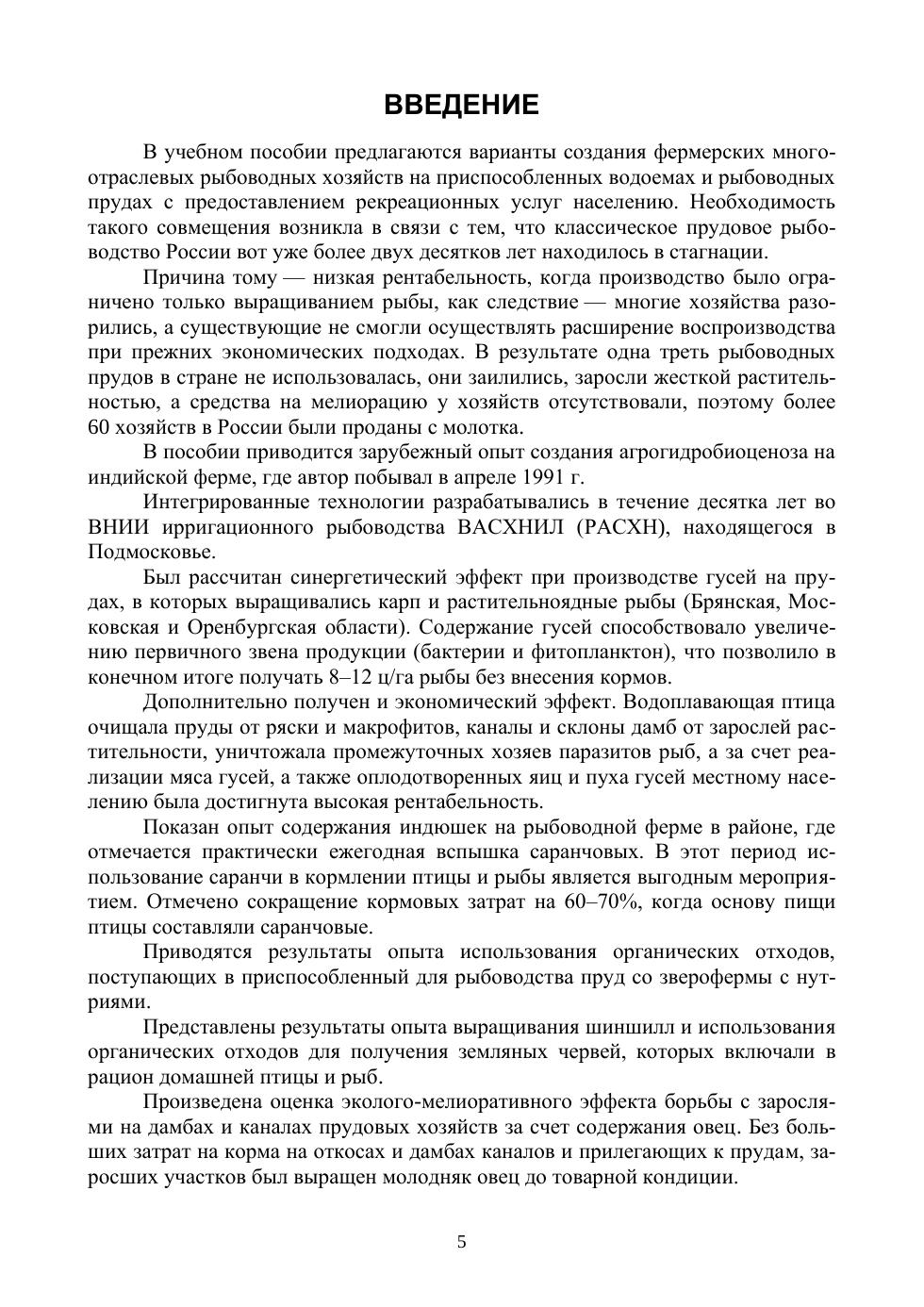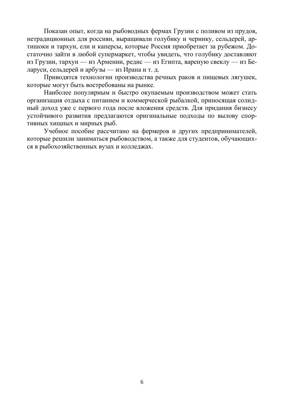 В учебном пособии предлагаются варианты создания фермерских многоотраслевых рыбоводных хозяйств на приспособленных водоемах и рыбоводных прудах с предоставлением рекреационных услуг населению. Приводится как образец зарубежный опыт создания агрогидробиоценоза на индийской ферме. Показан экономический эффект при производстве гусей на прудах, в которых выращивались карп и растительноядные рыбы. Содержания индюшек на рыбоводной ферме, в районе, где отмечается практически ежегодная вспышка саранчовых, оказалась выгодным мероприятием. Отмечено сокращение кормовых затрат для птицы и рыбы на 60–70%. Представлены результаты опыта выращивания шиншилл и использование органических отходов для культивирования земляных червей, которых включали в рацион домашней птице и осетрам. Произведена оценка эколого-мелиоративного эффекта борьбы с зарослями на дамбах и каналах прудовых хозяйств за счет содержания овец. Без больших затрат на корма на откосах и дамбах каналов и прилегающих к прудам заросших участков был выращен молодняк до товарной кондиции. Показан зарубежный опыт выращивания на рыбоводных фермах, с поливом из прудов, нетрадиционных для россиян, голубики или черники, сельдерея, артишоков и тархуна, елей и каперсов. Приводятся технологии производства на рыбоводных фермах речных раков и пищевых лягушек, которые могут быть востребованы на рынке. Наиболее популярным и эффективным вложением средств может стать организация отдыха с питанием и коммерческой рыбалкой, приносящим солидный доход уже с первого года работы фермы. Для придания этого устойчивого бизнеса предлагаются оригинальные подходы по вылову спортивных хищных и мирных рыб. Учебное пособие рассчитано на фермеров и других предпринимателей, которые решили заниматься рыбоводством, а также для студентов, обучающихся в рыбохозяйственных вузах.