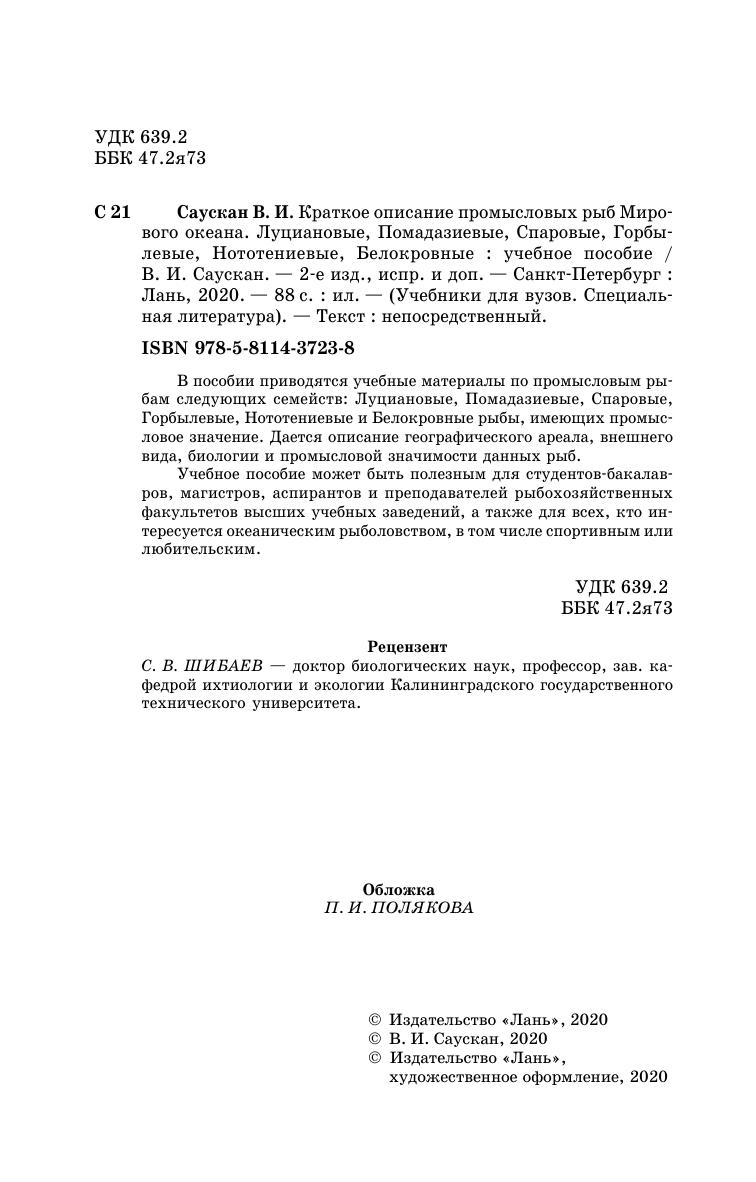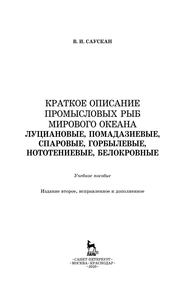 В пособии приводятся учебные материалы по промысловым рыбам следующих семейств: Луциановые, Помадазиевые, Спаровые, Горбылевые, Нототениевые и Белокровные рыбы, имеющих промысловое значение. Дается описание географического ареала, внешнего вида, биологии и промысловой значимости данных рыб.
