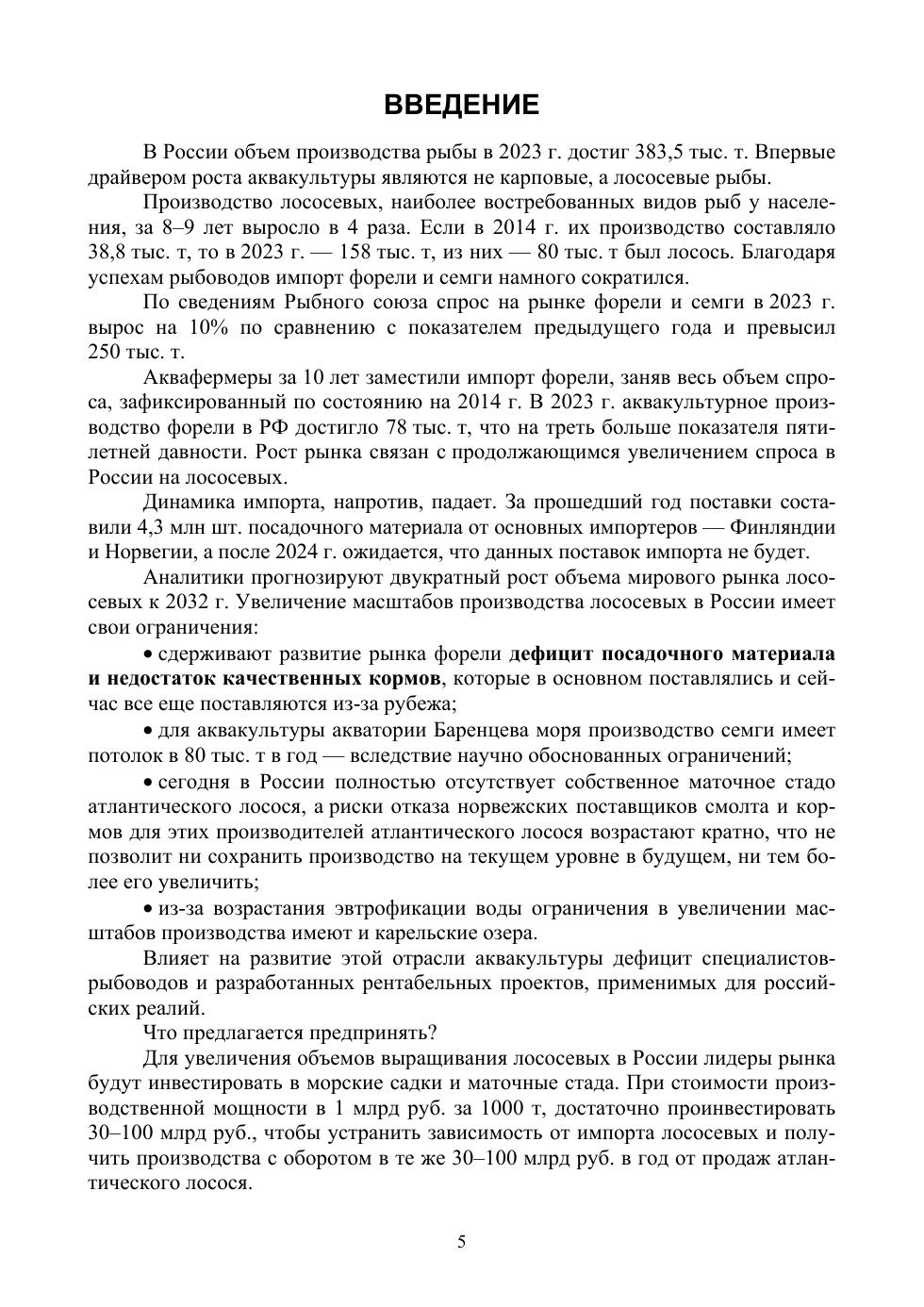В учебном пособии уделено внимание различным технологиям производства рыбы в бассейнах и садках и разным объектам выращивания: форели, семге, каспийской и черноморской кумжи, а также белорыбице. Одним из важных моментов для поиска резервов производства форелей, с целью увеличения рентабельности, является аудит предприятия. В учебном пособии на примере трех форелевых хозяйств показаны подходы к такому анализу. Уделено внимание технологиям производства форелей в бассейнах и садках. Отдельно анализируется бизнес-план выращивания семги в морских садках. Приводится результат опыта выращивания кумжи в Черном море. Как бизнес идея предлагается выращивание каспийской кумжи без внесения искусственных кормов в морских садках. Отдельно представлена схема бизнес-проекта, который имеет место при берегоукрепительных работах на горной реке. Приводится расчет компенсации потерь запасам каспийской кумжи и другим гидробионтам при экологических нарушениях. Анализируя родство лососевидных рыб — белорыбицы с нельмой — предлагается технология их выращивания в бассейнах и садках. В заключении приводится инструкция по перевозки зародышей форели в изотермических ящиках. Книга рассчитана на фермеров и других предпринимателей, которые решили заниматься лососеводством, а также для студентов, обучающихся в рыбохозяйственных вузах.