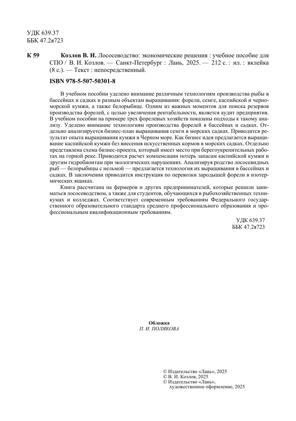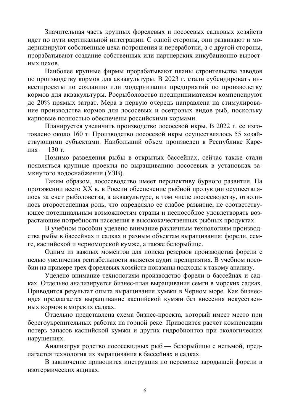 В учебном пособии уделено внимание различным технологиям производства рыбы в бассейнах и садках и разным объектам выращивания: форели, семге, каспийской и черноморской кумжи, а также белорыбице. Одним из важных моментов для поиска резервов производства форелей, с целью увеличения рентабельности, является аудит предприятия. В учебном пособии на примере трех форелевых хозяйств показаны подходы к такому анализу. Уделено внимание технологиям производства форелей в бассейнах и садках. Отдельно анализируется бизнес-план выращивания семги в морских садках. Приводится результат опыта выращивания кумжи в Черном море. Как бизнес идея предлагается выращивание каспийской кумжи без внесения искусственных кормов в морских садках. Отдельно представлена схема бизнес-проекта, который имеет место при берегоукрепительных работах на горной реке. Приводится расчет компенсации потерь запасам каспийской кумжи и другим гидробионтам при экологических нарушениях. Анализируя родство лососевидных рыб — белорыбицы с нельмой — предлагается технология их выращивания в бассейнах и садках. В заключении приводится инструкция по перевозки зародышей форели в изотермических ящиках. Книга рассчитана на фермеров и других предпринимателей, которые решили заниматься лососеводством, а также для студентов, обучающихся в рыбохозяйственных техникумах и колледжах. Соответствует современным требованиям Федерального государственного образовательного стандарта среднего профессионального образования и профессиональным квалификационным требованиям.