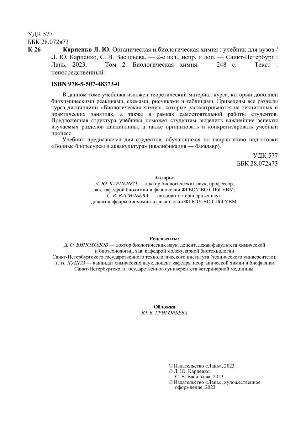 В данном томе учебника изложен теоретический материал курса, который дополнен биохимическими реакциями, схемами, рисунками и таблицами. Приведены все разделы курса дисциплины «Биологическая химия», которые рассматриваются на лекционных и практических занятиях, а также в рамках самостоятельной работы студентов. Предложенная структура учебника поможет студентам выделить важнейшие аспекты изучаемых разделов дисциплины, а также организовать и конкретизировать учебный процесс. Учебник предназначен для студентов, обучающихся по направлению подготовки «Водные биоресурсы и аквакультура» (квалификация — бакалавр).