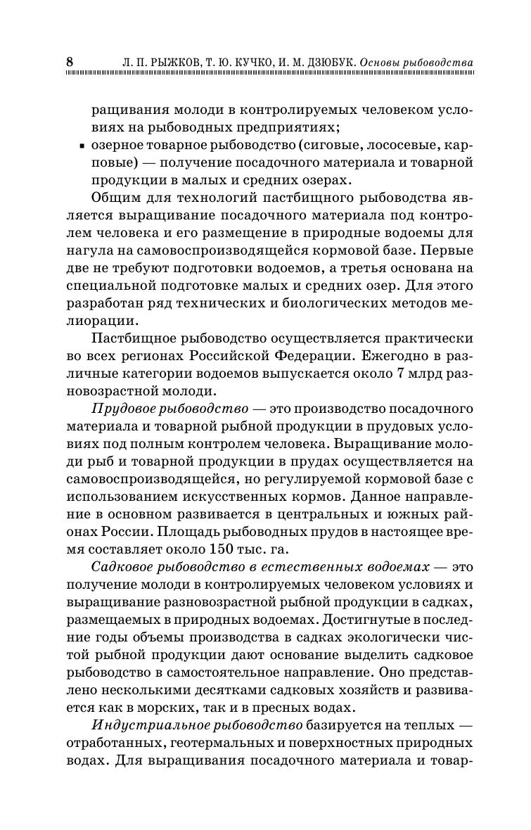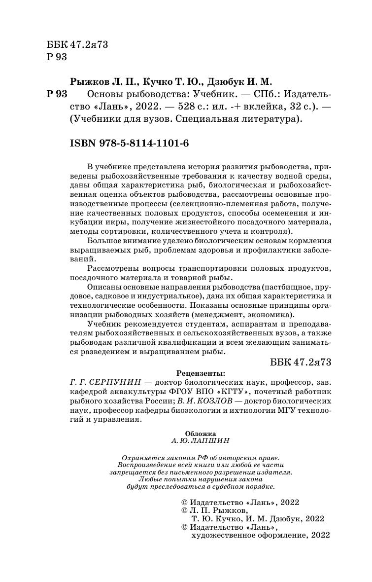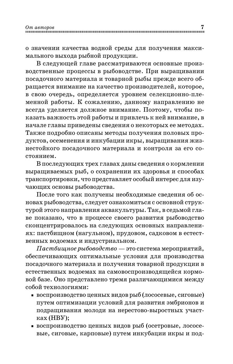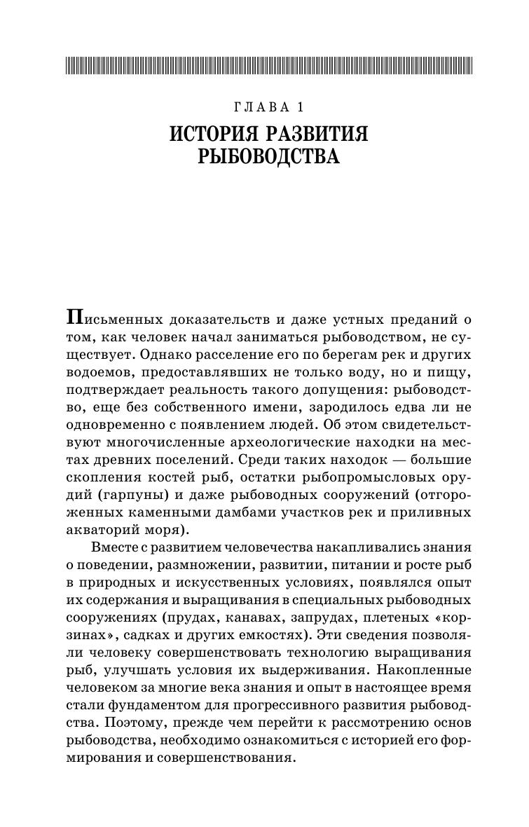 В учебнике представлена история развития рыбоводства, приведены рыбохозяйственные требования к качеству водной среды, даны общая характеристика рыб, биологическая и рыбохозяйственная оценка объектов рыбоводства, рассмотрены основные производственные процессы (селекционно-племенная работа, получение качественных половых продуктов, способы осеменения и инкубации икры, получение жизнестойкого посадочного материала, методы сортировки, количественного учета и контроля). Большое внимание уделено биологическим основам кормления выращиваемых рыб, проблемам здоровья и профилактики заболеваний. Рассмотрены вопросы транспортировки половых продуктов, посадочного материала и товарной рыбы. Описаны основные направления рыбоводства (пастбищное, прудовое, садковое и индустриальное), дана их общая характеристика и технологические особенности. Показаны основные принципы организации рыбоводных хозяйств (менеджмент, экономика). Учебник рекомендуется студентам, аспирантам и преподавателям рыбохозяйственных и сельскохозяйственных вузов, а также рыбоводам различной квалификации и всем желающим заниматься разведением и выращиванием рыбы.