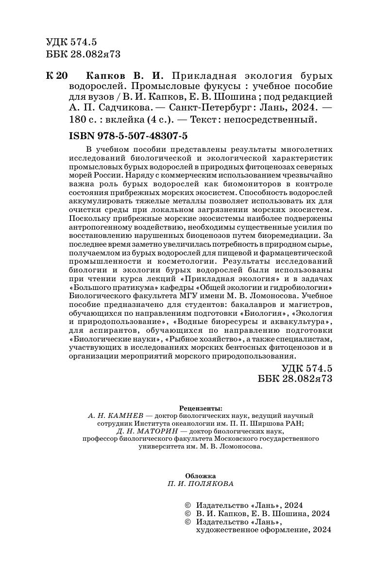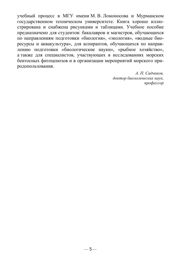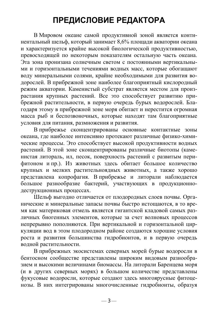В учебном пособии представлены результаты многолетних исследований биологической и экологической характеристик промысловых бурых водорослей в природных фитоценозах северных морей России. Наряду с коммерческим использованием чрезвычайно важна роль бурых водорослей как биомониторов в контроле состояния прибрежных морских экосистем. Способность водорослей аккумулировать тяжелые металлы позволяет использовать их для очистки среды при локальном загрязнении морских экосистем. Поскольку прибрежные морские экосистемы наиболее подвержены антропогенному воздействию, необходимы существенные усилия по восстановлению нарушенных биоценозов путем биоремедиации. За последнее время заметно увеличилась потребность в природном сырье, получаемлом из бурых водорослей для пищевой и фармацевтической промышленности и косметологии. Результаты исследований биологии и экологии бурых водорослей были использованы при чтении курса лекций «Прикладная экология» и в задачах «Большого пратикума» кафедры «Общей экологии и гидробиологии» Биологического факультета МГУ имени М.В.Ломоносова. Учебное пособие предназначено для студентов: бакалавров и магистров, обучающихся по направлениям подготовки «Биология», «Экология и природопользование», «Водные биоресурсы и аквакультура», для аспирантов, обучающихся по направлению подготовки «Биологические науки», «Рыбное хозяйство», а также специалистам, участвующих в исследованиях морских бентосных фитоценозов и в организации мероприятий морского природопользования.