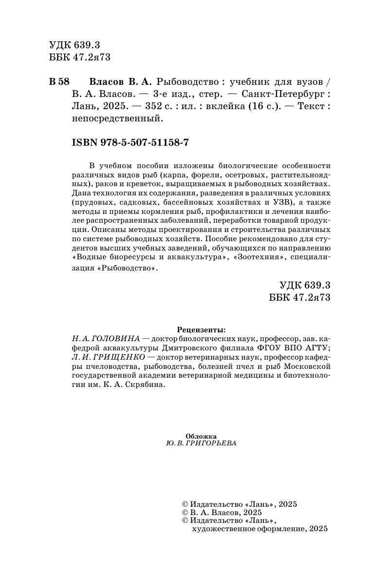 В учебном пособии изложены биологические особенности различных видов рыб (карпа, форели, осетровых, растительноядных), раков и креветок, выращиваемых в рыбоводных хозяйствах. Дана технология их содержания, разведения в различных условиях (прудовых, садковых, бассейновых хозяйствах и УЗВ), а также методы и приемы кормления рыб, профилактики и лечения наиболее распространенных заболеваний, переработки товарной продукции. Описаны методы проектирования и строительства различных по системе рыбоводных хозяйств. Пособие рекомендовано для студентов высших учебных заведений, обучающихся по направлению «Водные биоресурсы и аквакультура», «Зоотехния», специализация «Рыбоводство».