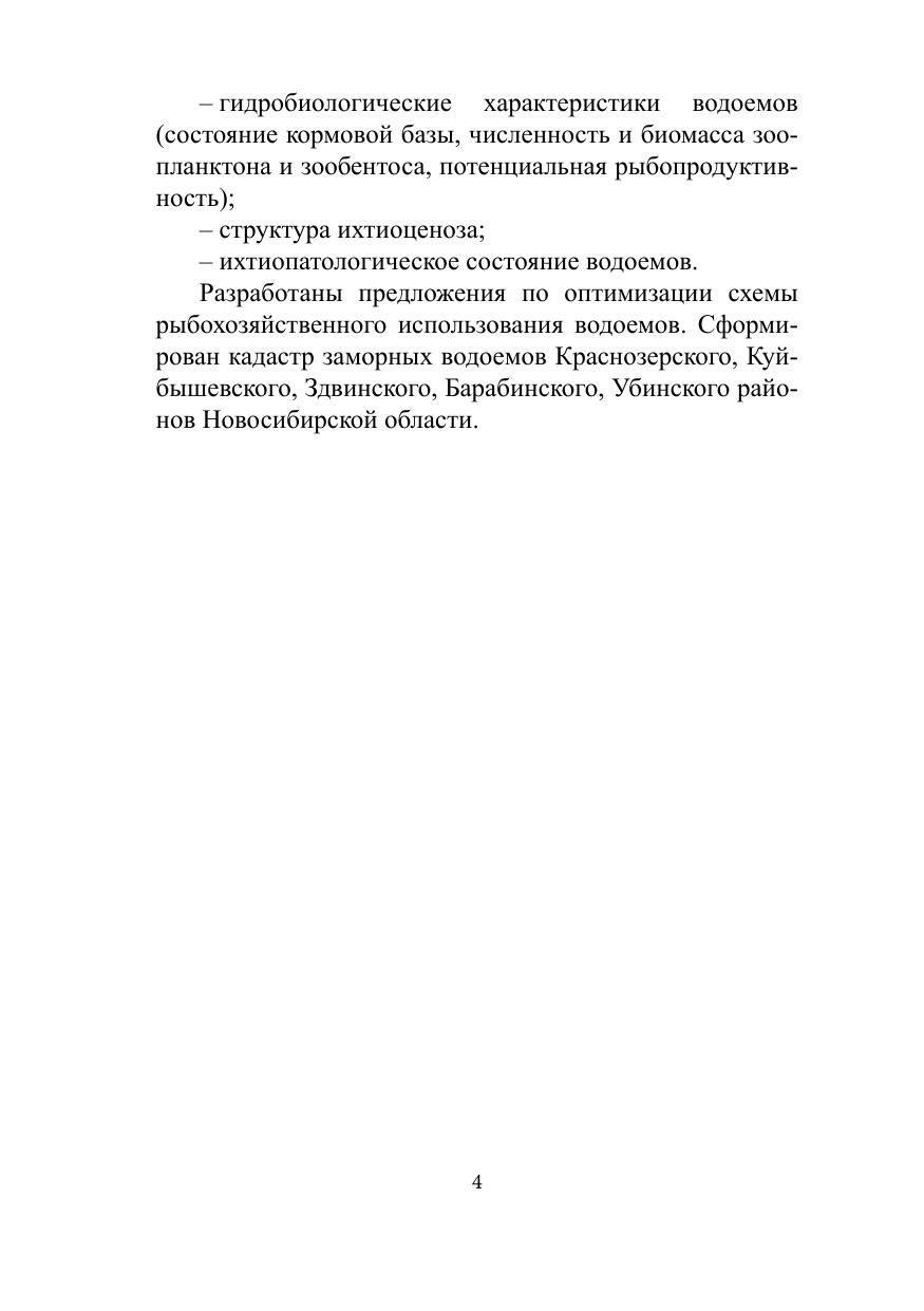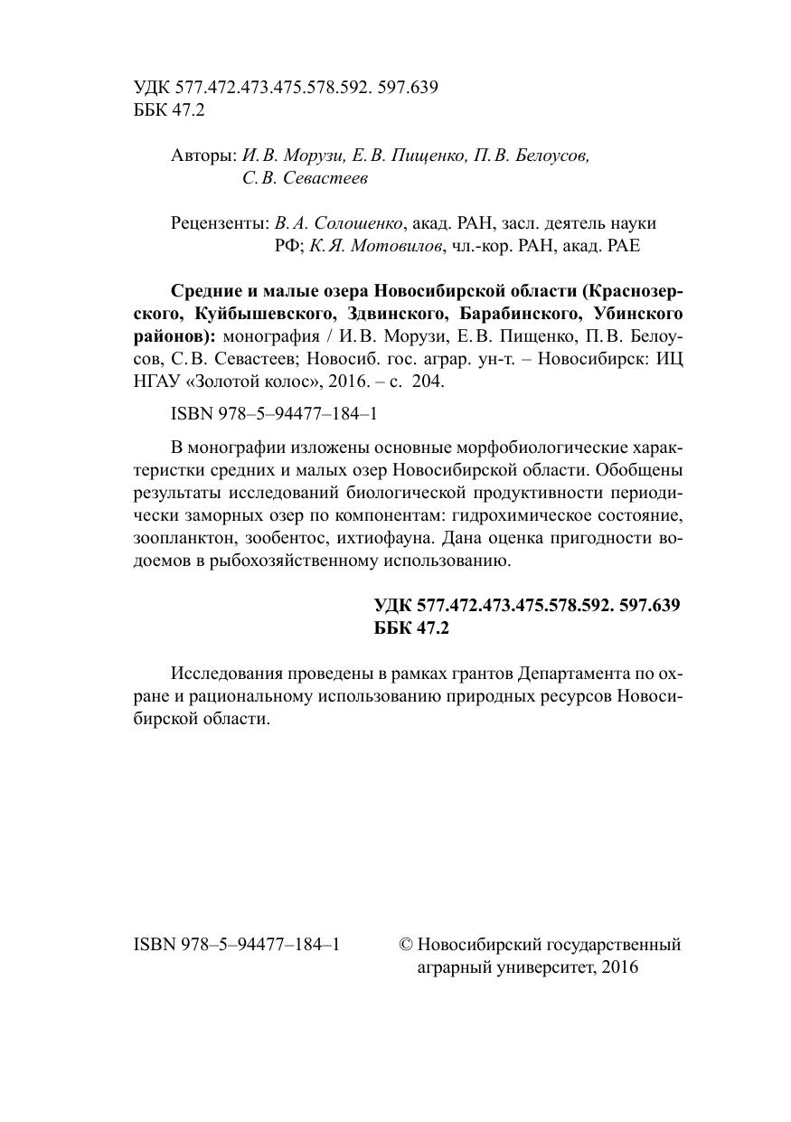 В монографии изложены основные морфобиологические характеристки средних и малых озер Новосибирской области. Обобщены результаты исследований биологической продуктивности периодически заморных озер по компонентам: гидрохимическое состояние, зоопланктон, зообентос, ихтиофауна. Дана оценка пригодности водоемов в рыбохозяйственному использованию. Исследования проведены в рамках грантов Департамента по охране и рациональному использованию природных ресурсов Новосибирской области.