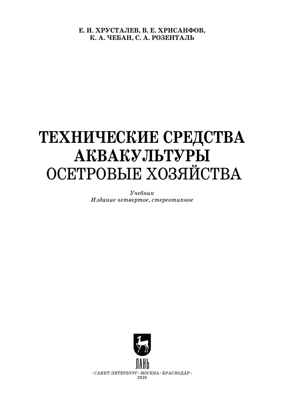 В учебнике рассматриваются системы водоподготовки и водоснабжения осетровых хозяйств, классифицированных на рыбопитомнике, товарные хозяйства, установки замкнутого водоснабжения (УЗВ). Системы водоподготовки и водообеспечения рассматриваются с позиции использования технических средств, обеспечивающих необходимое качество воды, подаваемой в рыбоводные системы и выходящей из них, технические средства, используемые для содержания производителей, инкубации икры, выдерживания предличинок, выращивания личинок и молоди, а также при товарном выращивании осетровых, а также сортировальные устройства, кормораздатчики и др. Дана техническая характеристика узлов УЗВ, обеспечивающих условия для разведения и выращивания рыбы, механической и биологической фильтрации воды, обеззараживание и оксигенация воды. Представлена характеристика к техническому обеспечению процесса транспортировки оплодотворённой икры, молоди, товарной рыбы. В конце каждой главы предлагаются вопросы для самопроверки. В конце учебника дается глоссарий и список рекомендуемой литературы. Соответствует современным требованиям Федерального государственного образовательного стандарта среднего профессионального образования и профессиональным квалификационным требованиям. Издание предназначено для студентов профильных колледжей и техникумов. Учебник может быть полезен специалистам рыбоводных и фермерских хозяйств.