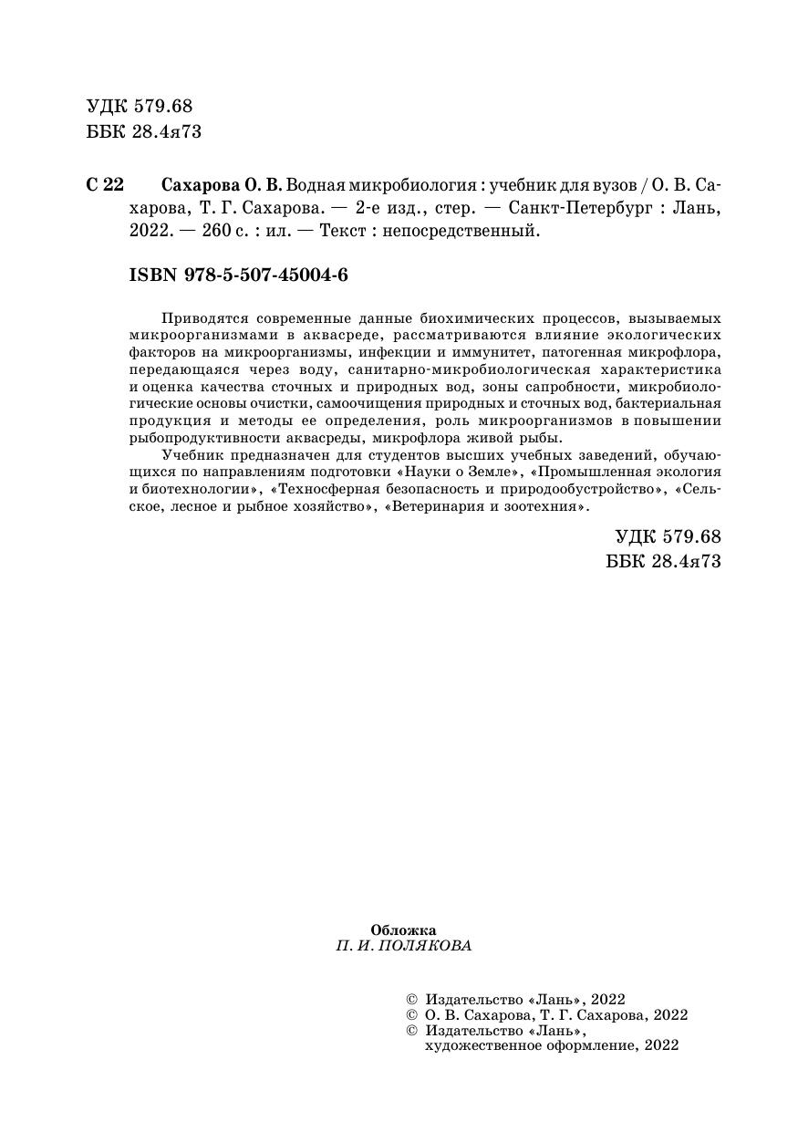 Приводятся современные данные биохимических процессов, вызываемых микроорганизмами в аквасреде, рассматриваются влияние экологических факторов на микроорганизмы, инфекции и иммунитет, патогенная микрофлора, передающаяся через воду, санитарно-микробиологическая характеристика и оценка качества сточных и природных вод, зоны сапробности, микробиологические основы очистки, самоочищения природных и сточных вод, бактериальная продукция и методы ее определения, роль микроорганизмов в повышении рыбопродуктивности аквасреды, микрофлора живой рыбы. Учебник предназначен для студентов высших учебных заведений, обучающихся по направлениям подготовки «Науки о Земле», «Промышленная экология и биотехнологии», «Техносферная безопасность и природообустройство», «Сельское, лесное и рыбное хозяйство», «Ветеринария и зоотехния».
