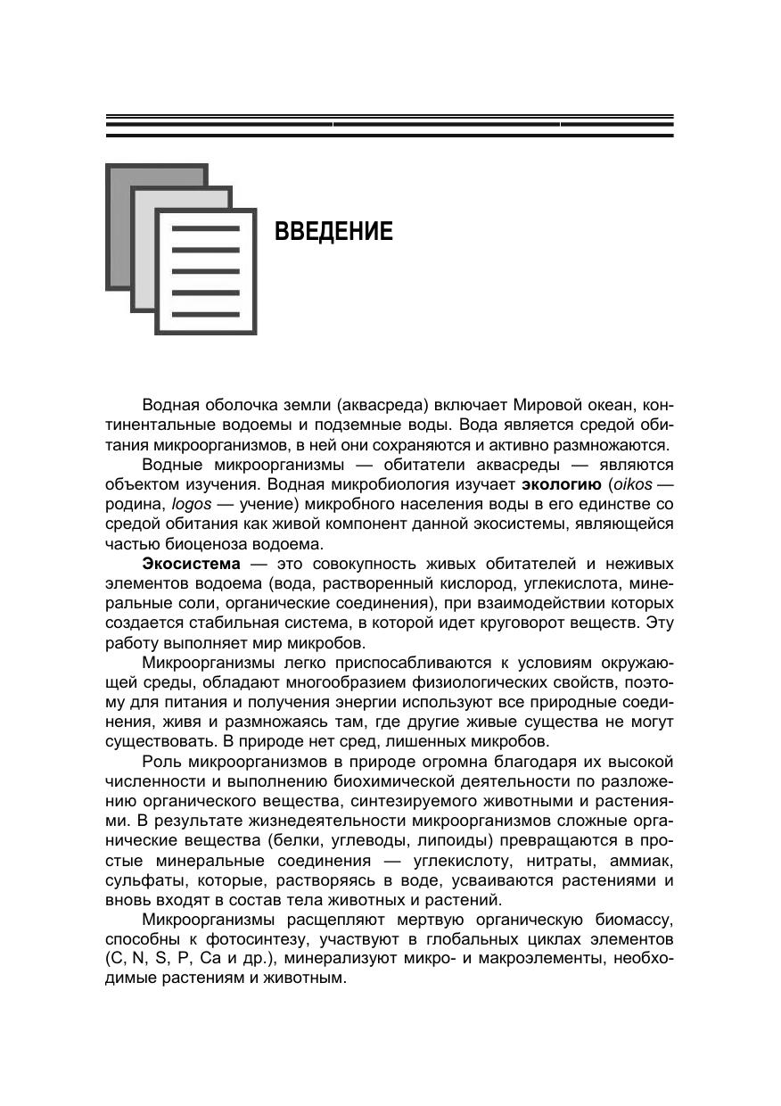 Приводятся современные данные биохимических процессов, вызываемых микроорганизмами в аквасреде, рассматриваются влияние экологических факторов на микроорганизмы, инфекции и иммунитет, патогенная микрофлора, передающаяся через воду, санитарно микробиологическая характеристика и оценка качества сточных и природных вод, зоны сапробности, микробиологические основы очистки, самоочищения природных и сточных вод, бактериальная продукция и методы ее определения, роль микроорганизмов в повышении рыбопродуктивности аквасреды, микрофлора живой рыбы. Соответствует современным требованиям Федерального государственного образовательного стандарта среднего профессионального образования и профессиональным квалификационным требованиям. Учебник предназначен для студентов колледжей и техникумов.