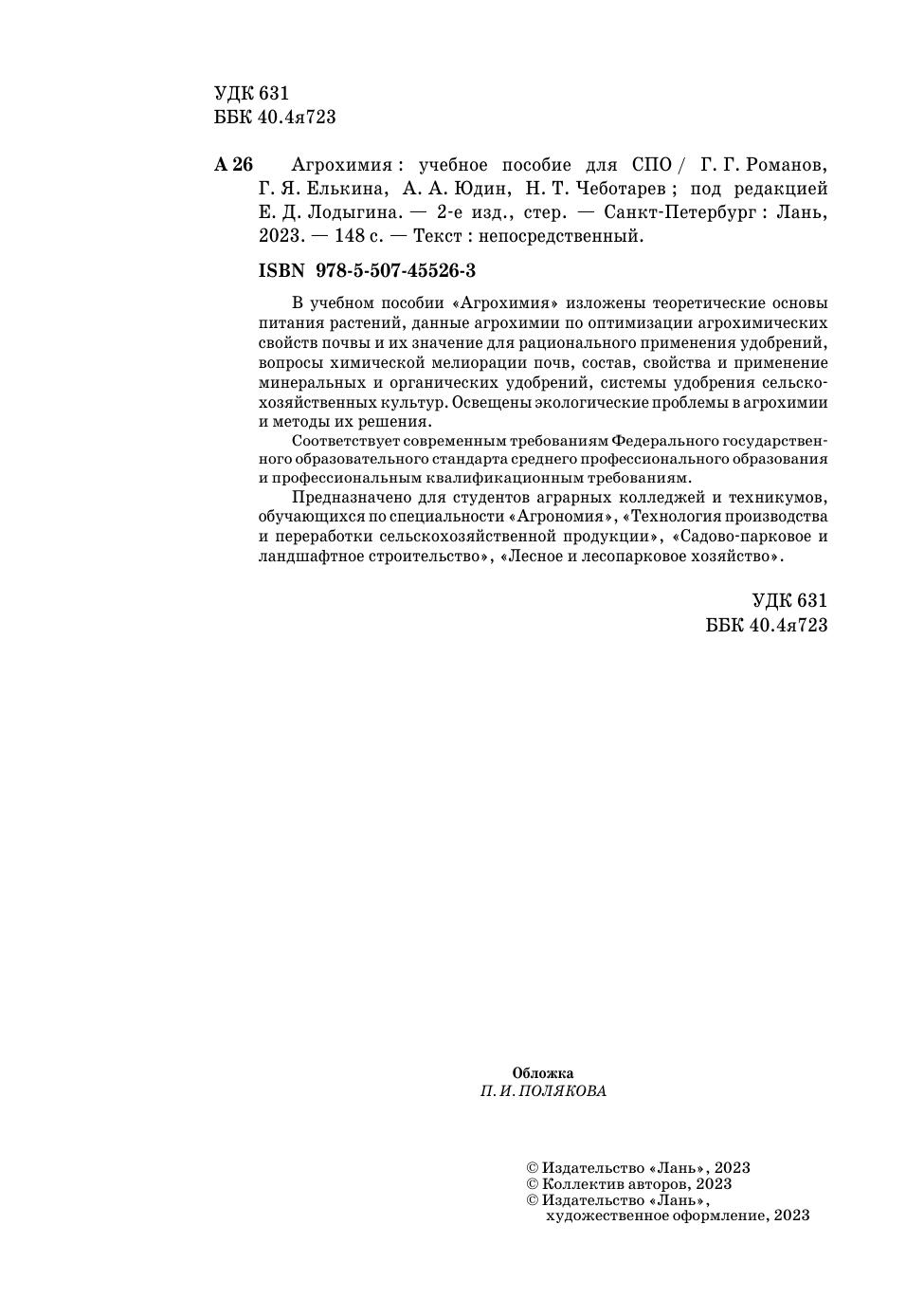 В учебном пособии Агрохимия изложены теоретические основы питания растений, данные агрохимии по оптимизации агрохимических свойств почвы и их значение для рационального применения удобрений, вопросы химической мелиорации почв, состав, свойства и применение минеральных и органических удобрений, системы удобрения сельско-хозяйственных культур. Освещены экологические проблемы в агрохимии и методы их решения. Соответствует современным требованиям Федерального государственного образовательного стандарта среднего профессионального образования и профессиональным квалификационным требованиям. Предназначено для студентов аграрных колледжей и техникумов, обучающихся по специальности Агрономия, Технология производства и переработки сельскохозяйственной продукции, Садово-парковое и ландшафтное строительство, Лесное и лесопарковое хозяйство.