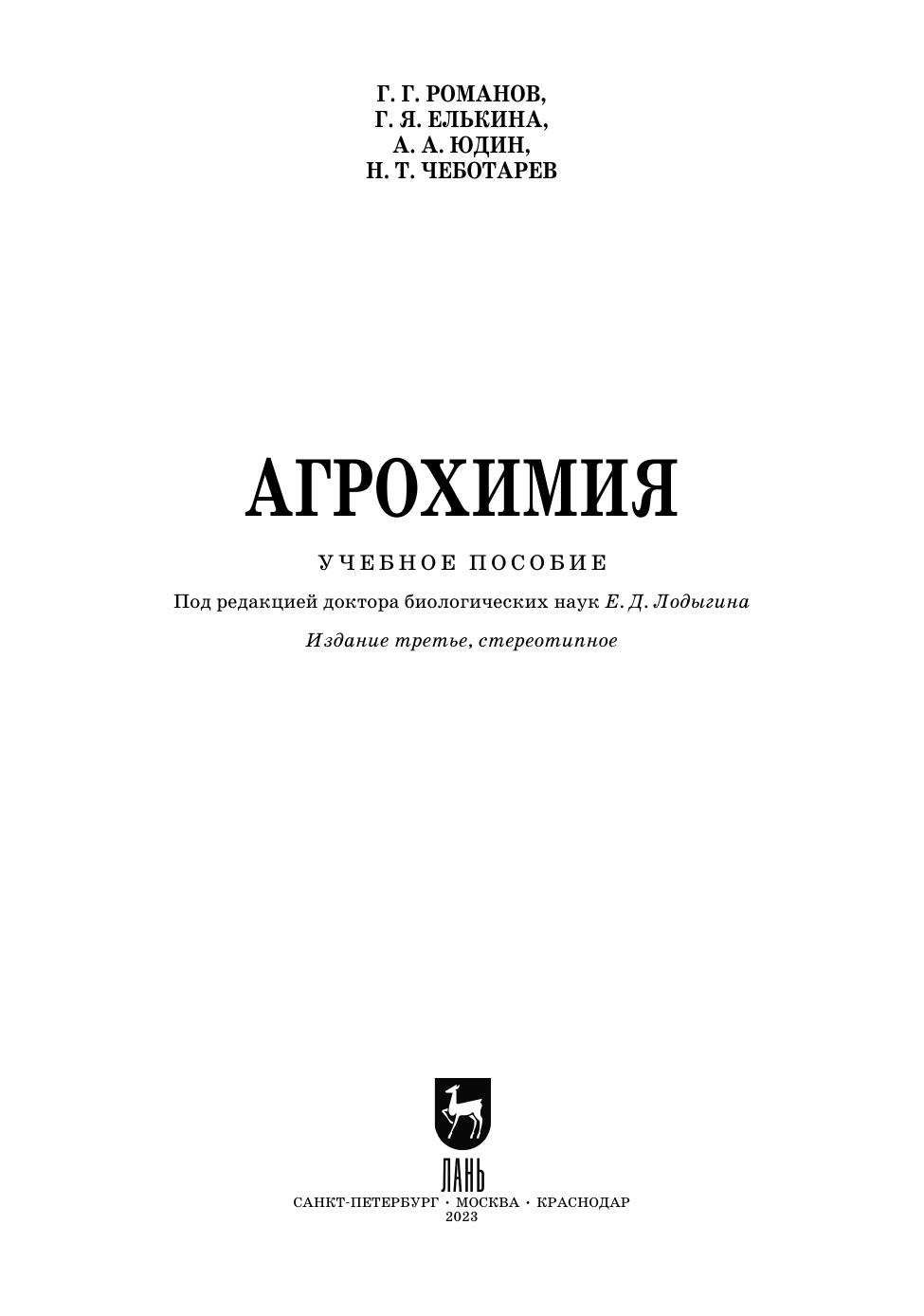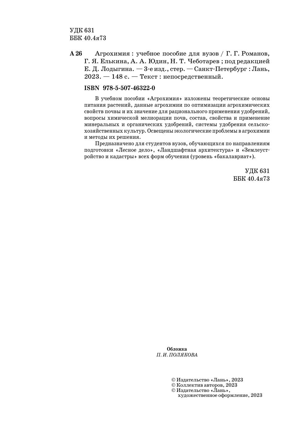 В учебном пособии «Агрохимия» изложены теоретические основы питания растений, данные агрохимии по оптимизации агрохимических свойств почвы и их значение для рационального применения удобрений, вопросы химической мелиорации почв, состав, свойства и применение минеральных и органических удобрений, системы удобрения сельскохозяйственных культур. Освещены экологические проблемы в агрохимии и методы их решения. Предназначено для студентов, обучающихся по направлениям подготовки «Лесное дело», «Ландшафтная архитектура» и «Землеустройство и кадастры» всех форм обучения (уровень «бакалавриат»).