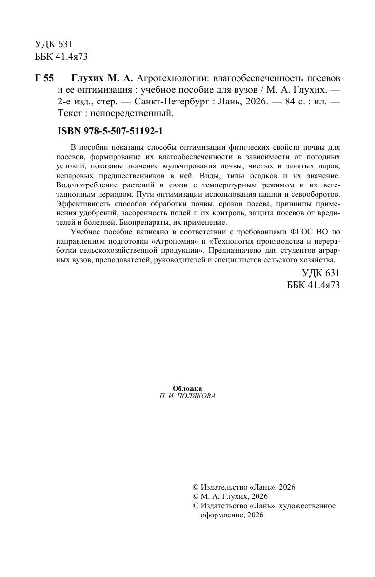 В пособии показаны способы оптимизации физических свойств почвы для посевов, формирование их влагообеспеченности в зависимости от погодных условий, показаны значение мульчирования почвы, чистых и занятых паров, непаровых предшественников в ней. Виды, типы осадков и их значение. Водопотребление растений в связи с температурным режимом и их вегетационным периодом. Пути оптимизации использования пашни и севооборотов. Эффективность способов обработки почвы, сроков посева, принципы применения удобрений, засоренность полей и их контроль, защита посевов от вредителей и болезней. Биопрепараты, их применение. Учебное пособие написано в соответствии с требованиями ФГОС ВО по направлениям подготовки «Агрономия» и «Технология производства и переработки сельскохозяйственной продукции». Предназначено для студентов аграрных вузов, преподавателей, руководителей и специалистов сельского хозяйства.