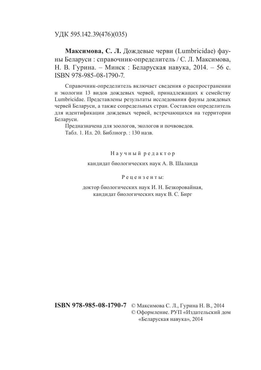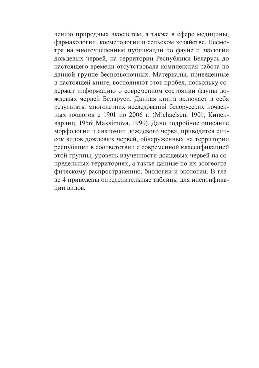 Справочник-определитель включает сведения о распространении и экологии 13 видов дождевых червей, принадлежащих к семейству Lumbricidae. Представлены результаты исследования фауны дождевых червей Беларуси, а также сопредельных стран. Составлен определитель для идентификации дождевых червей, встречающихся на территории Беларуси. Предназначена для зоологов, экологов и почвоведов.