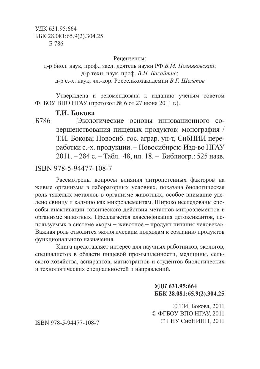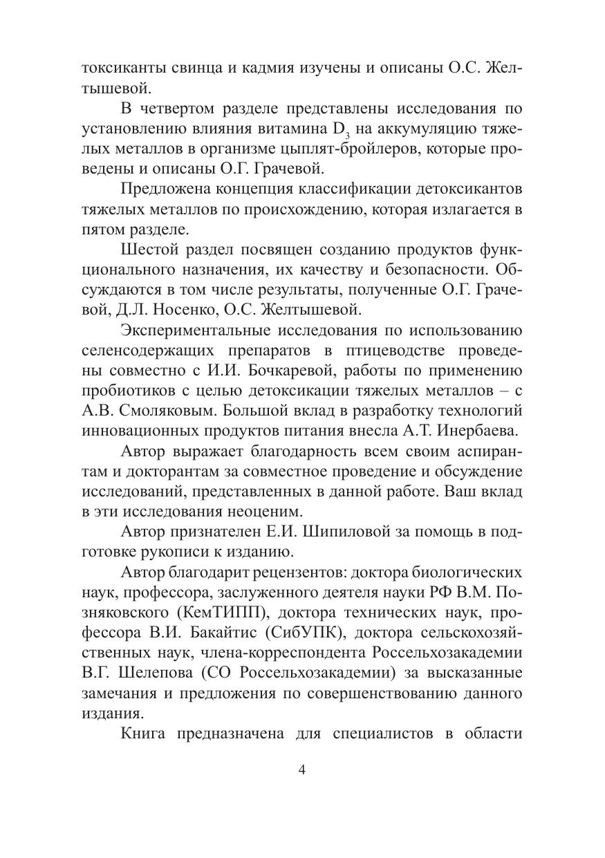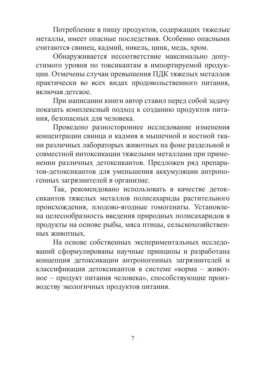 Рассмотрены вопросы влияния антропогенных факторов на живые организмы в лабораторных условиях, показана биологическая роль тяжелых металлов в организме животных, особое внимание уделено свинцу и кадмию как микроэлементам. Широко исследованы способы инактивации токсического действия металлов-микроэлементов в организме животных. Предлагается классификация детоксикантов, используемых в системе «корм – животное – продукт питания человека». Важная роль отводится экологическим подходам к созданию продуктов функционального назначения. Книга представляет интерес для научных работников, экологов, специалистов в области пищевой промышленности, медицины, сельского хозяйства, аспирантов, магистрантов и студентов биологических и технологических специальностей и направлений.