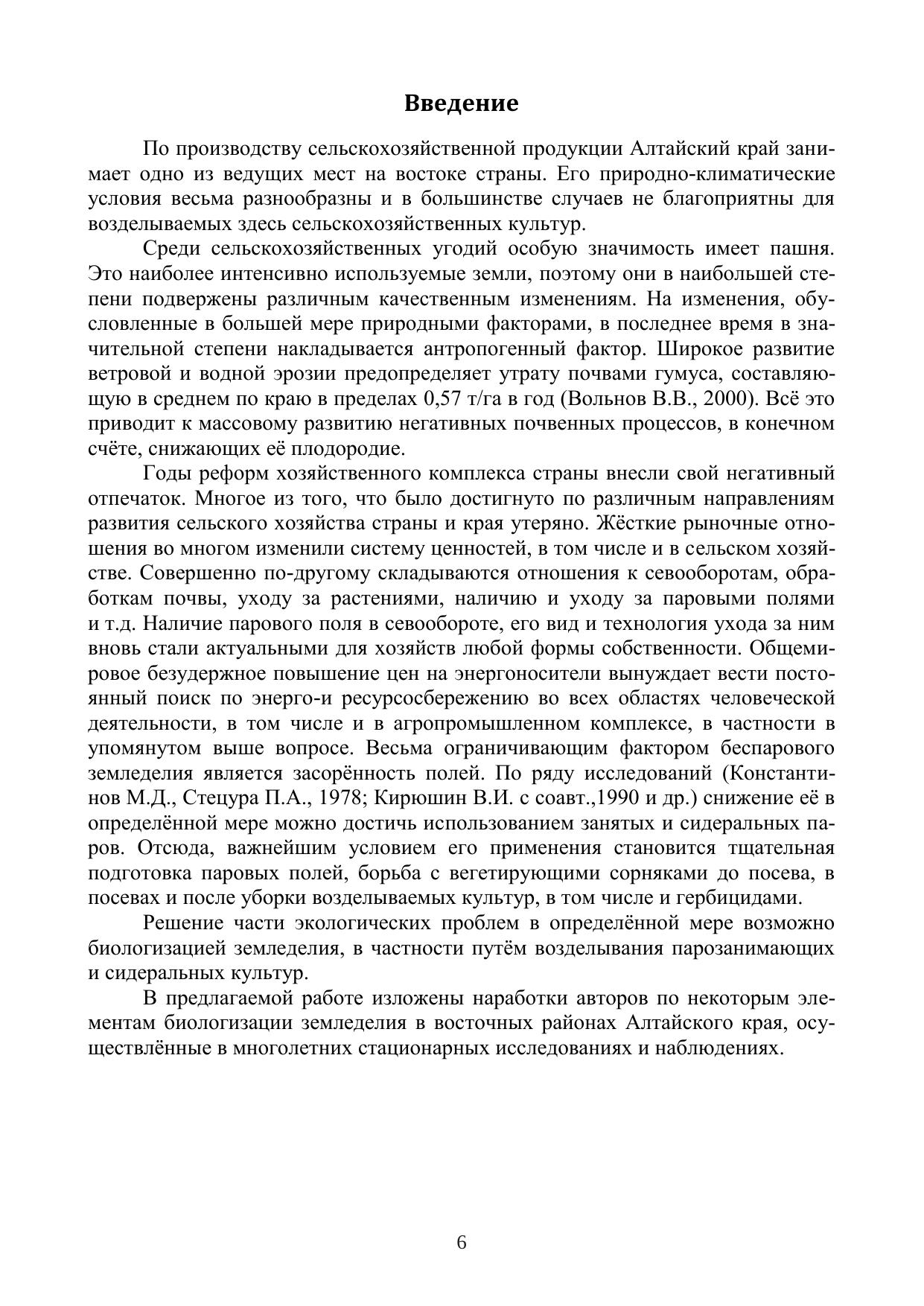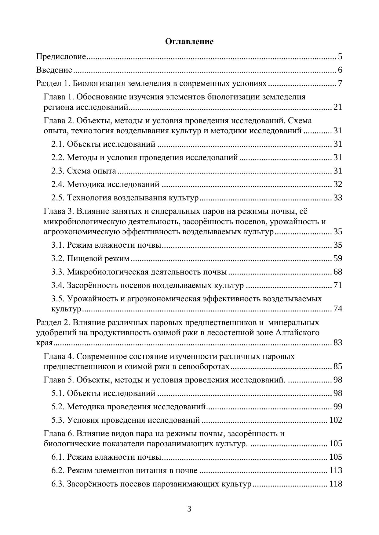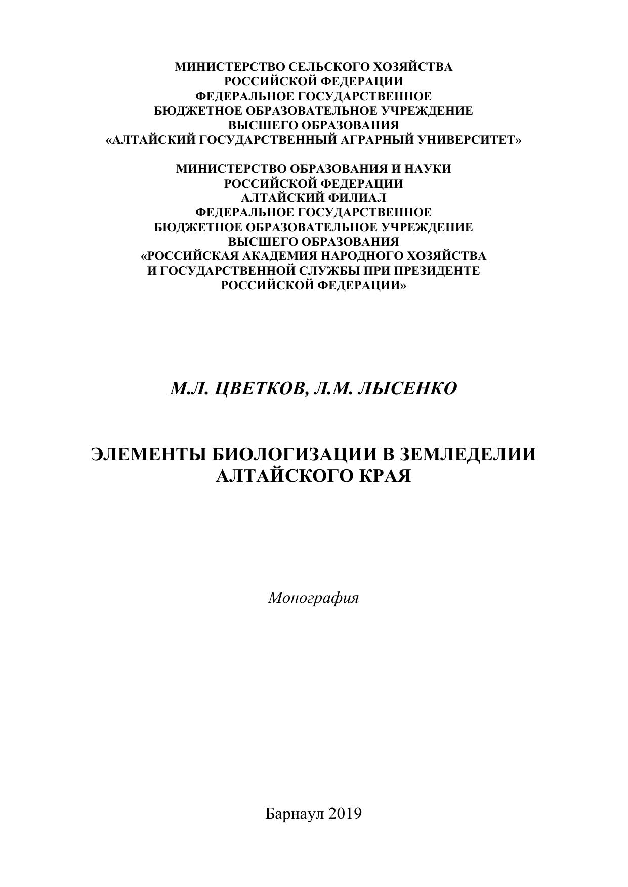 В научном издании обобщаются результаты многолетних исследований авторов по вопросам биологизации земледелия в условиях восточных районов Алтайского края с проведением анализа обозначенных вопросов в других реги-онах страны. Приводятся данные, характеризующие водный и пищевой режимы почвы, засорённость посевов парозанимающих культур и возделываемых по ним сельскохозяйственным растениям и целый ряд других изучаемых показате-лей (микробиологическая деятельность почвы, сохранность, рост и развитие парозанимающих культур и возделываемых по ним растений, динамика приро-ста биомассы и фотосинтетические показатели возделываемой озимой ржи и др.). Приведены сведения по агроэкономической оценке приёмов биологизации земледелия для условий восточных районов Алтайского края. Монография предназначена для научных работников, специалистов сель-ского хозяйства, преподавателей, студентов, магистрантов и аспирантов аграр-ных вузов.