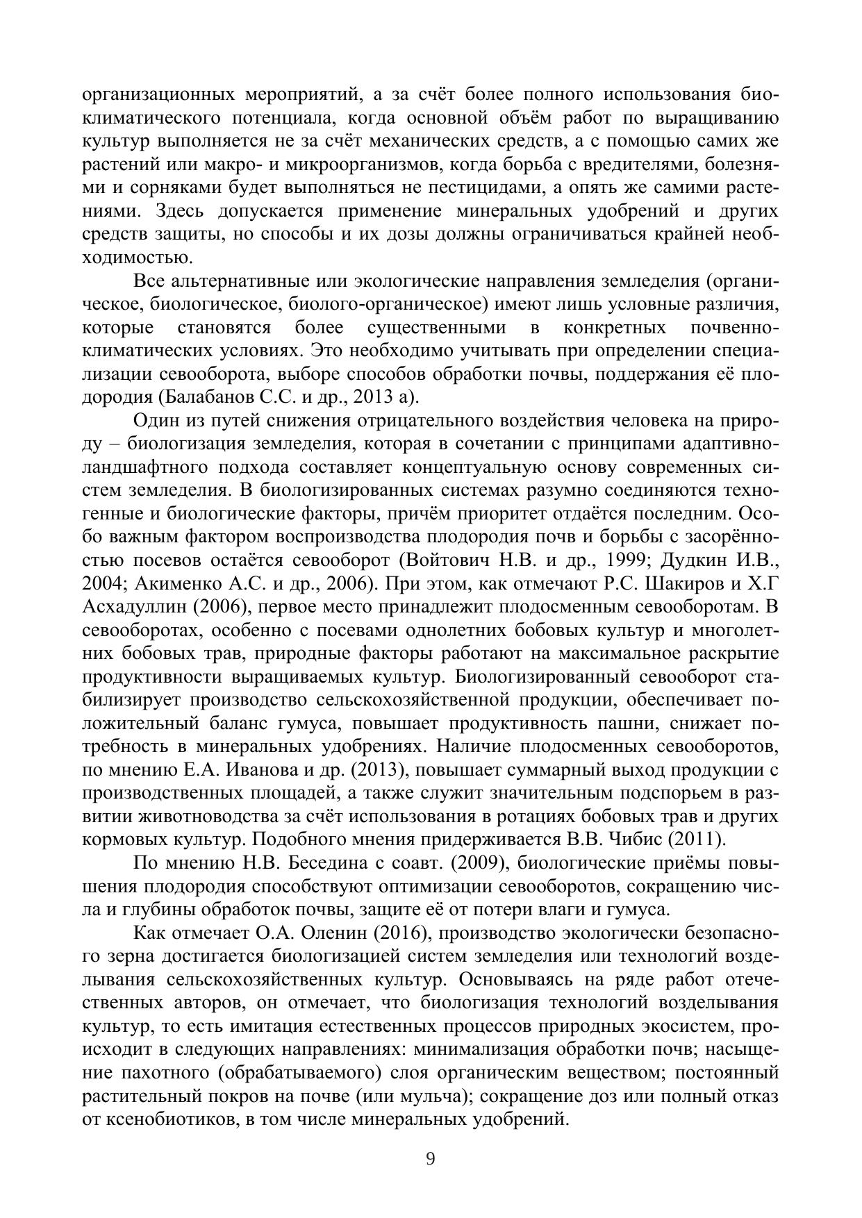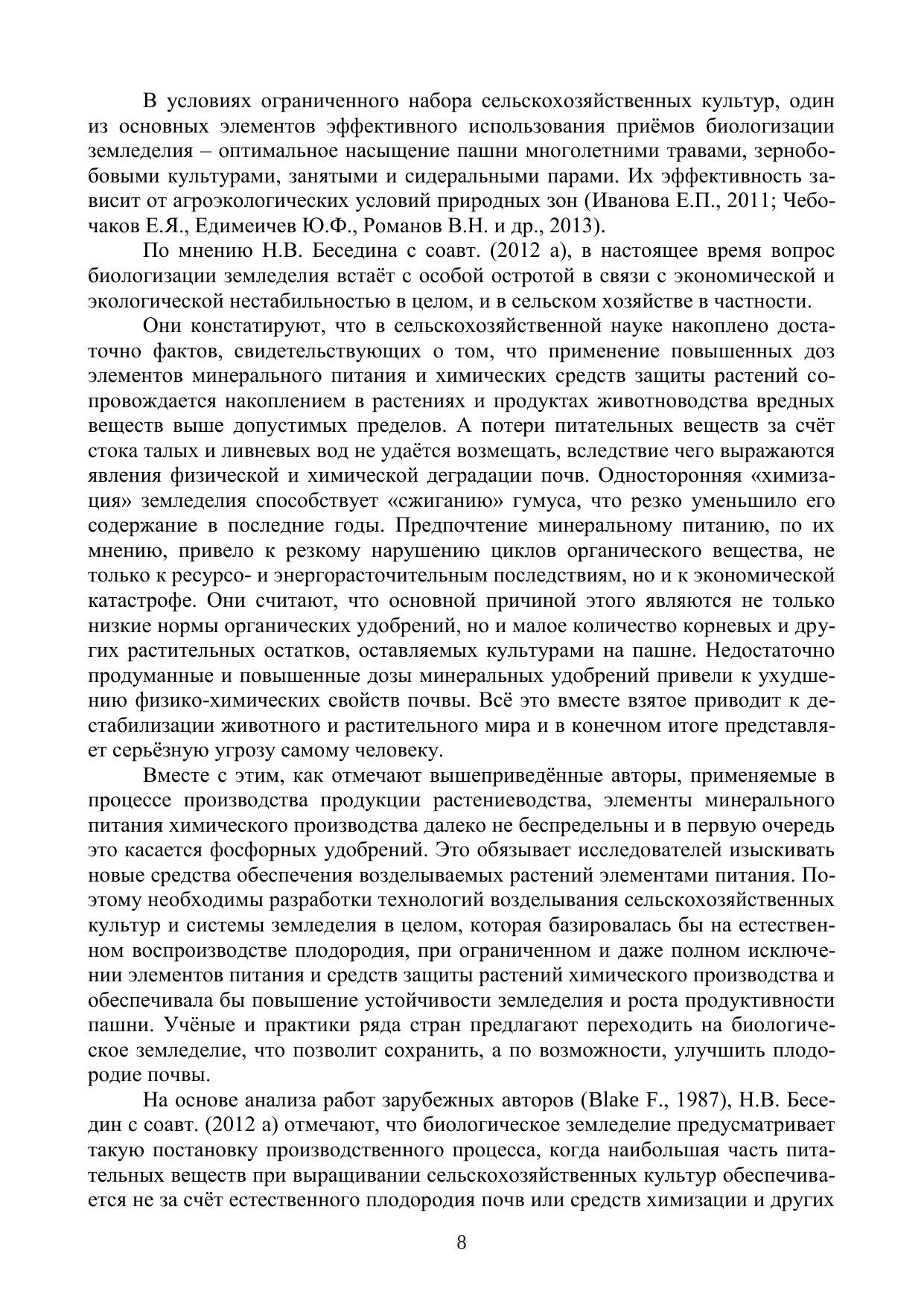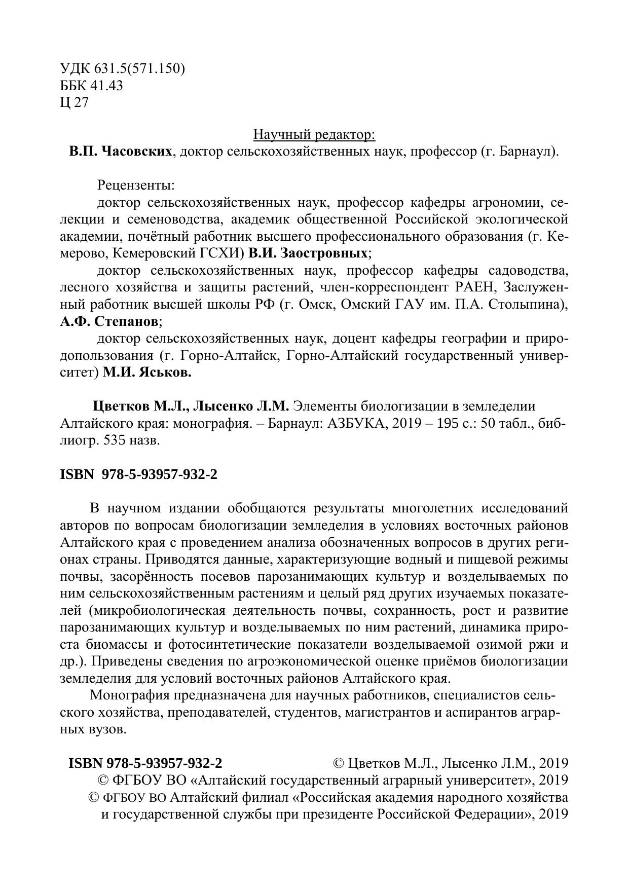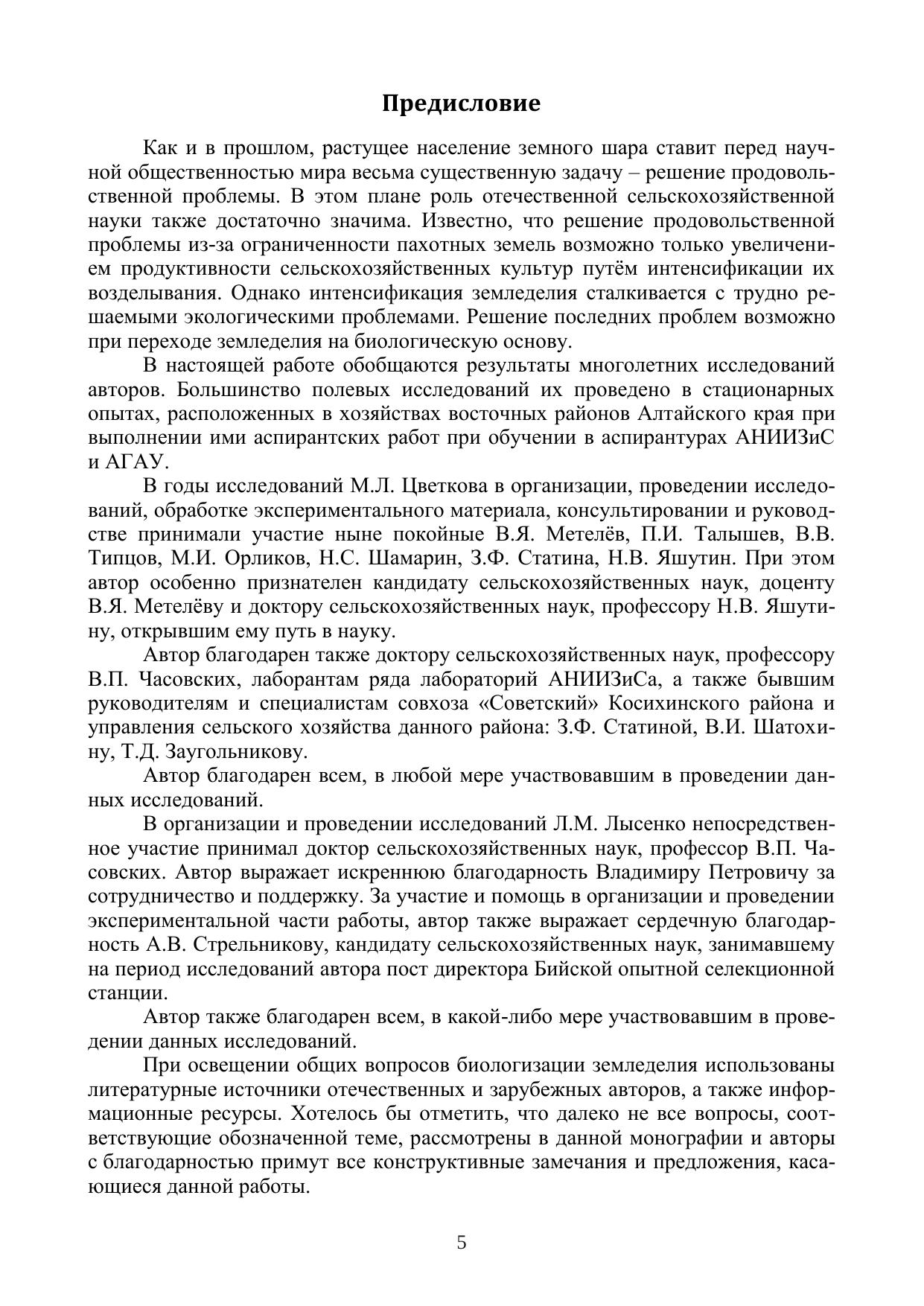 В научном издании обобщаются результаты многолетних исследований авторов по вопросам биологизации земледелия в условиях восточных районов Алтайского края с проведением анализа обозначенных вопросов в других реги-онах страны. Приводятся данные, характеризующие водный и пищевой режимы почвы, засорённость посевов парозанимающих культур и возделываемых по ним сельскохозяйственным растениям и целый ряд других изучаемых показате-лей (микробиологическая деятельность почвы, сохранность, рост и развитие парозанимающих культур и возделываемых по ним растений, динамика приро-ста биомассы и фотосинтетические показатели возделываемой озимой ржи и др.). Приведены сведения по агроэкономической оценке приёмов биологизации земледелия для условий восточных районов Алтайского края. Монография предназначена для научных работников, специалистов сель-ского хозяйства, преподавателей, студентов, магистрантов и аспирантов аграр-ных вузов.
