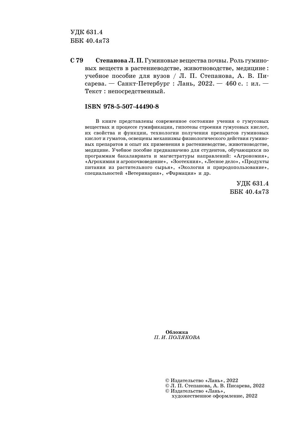 В книге представлены современное состояние учения о гумусовых веществах и процессе гумификации, гипотезы строения гумусовых кислот, их свойства и функции, технологии получения препаратов гуминовых кислот и гуматов, освещены механизмы физиологического действия гуминовых препаратов и опыт их применения в растениеводстве, животноводстве, медицине. Учебное пособие предназначено для студентов, обучающихся по программам бакалавриата и магистратуры направлений: «Агрономия», «Агрохимия и агропочвоведение», «Зоотехния», «Лесное дело», «Продукты питания из растительного сырья», «Экология и природопользование», специальностей «Ветеринария», «Фармация» и др.