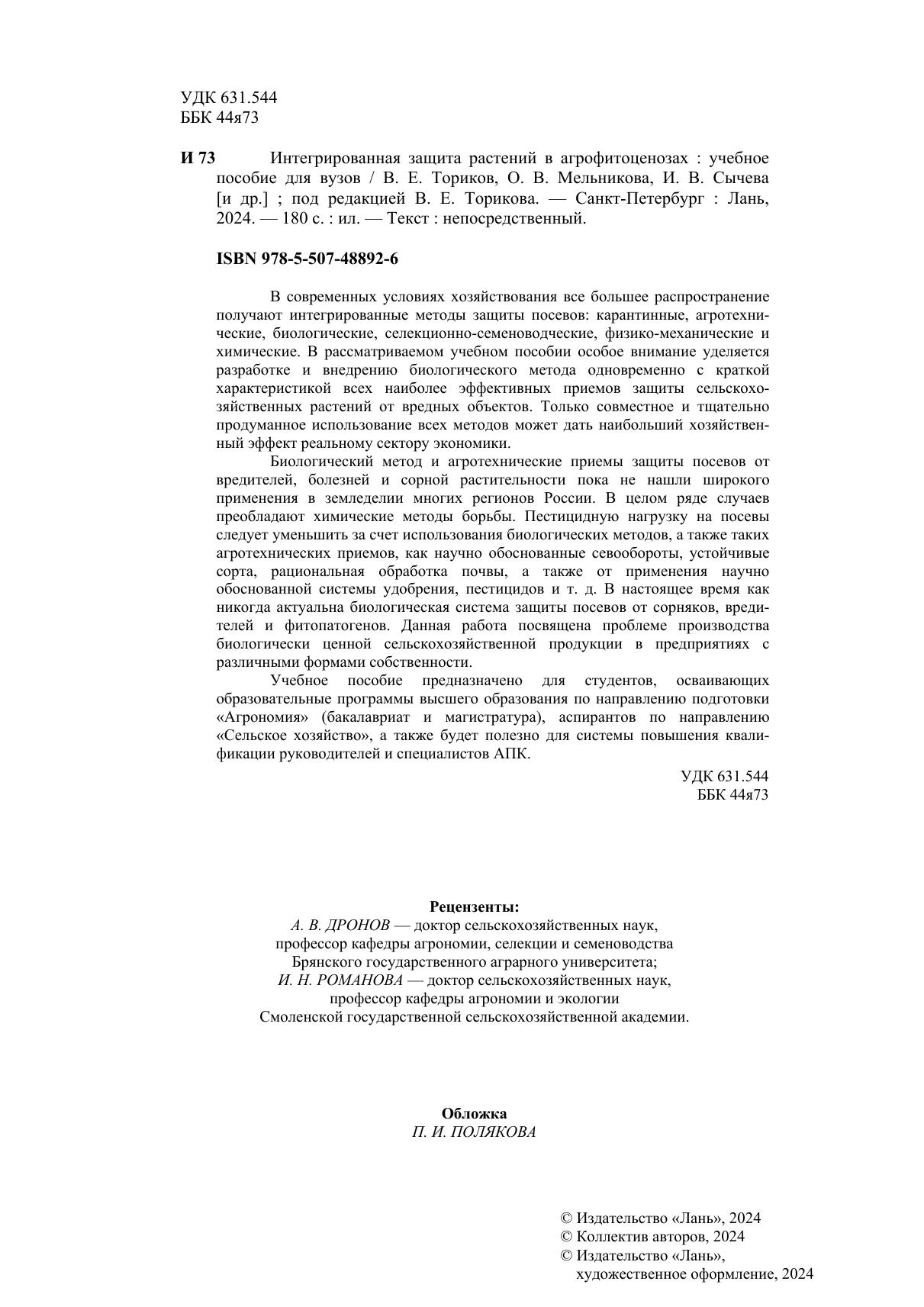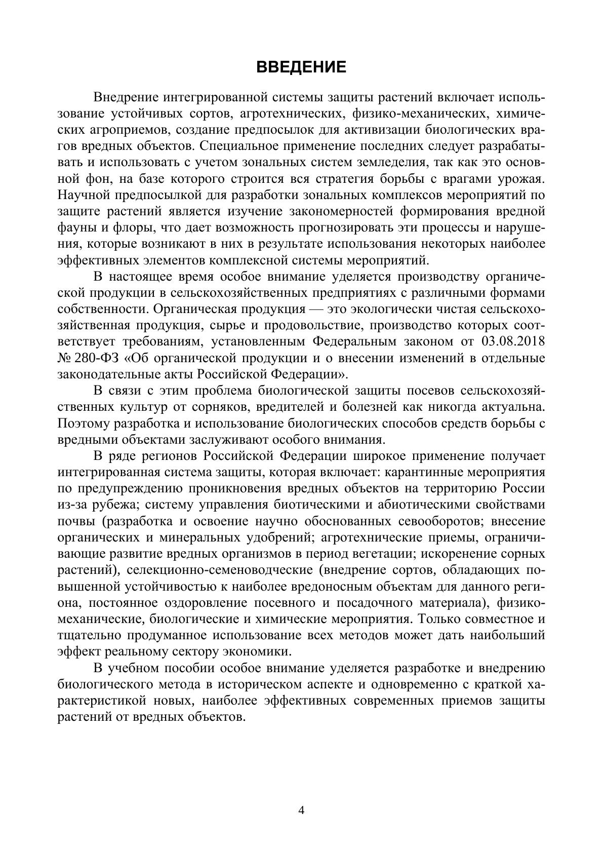 В современных условиях хозяйствования все большее распространение получают интегрированные методы защиты посевов: карантинные, агротехнические, биологические, селекционно-семеноводческие, физико-механические и химические. В рассматриваемом учебном пособии особое внимание уделяется разработке и внедрению биологического метода одновременно с краткой характеристикой всех наиболее эффективных приемов защиты сельскохозяйственных растений от вредных объектов. Только совместное и тщательно продуманное использование всех методов может дать наибольший хозяйственный эффект реальному сектору экономики. Биологический метод и агротехнические приемы защиты посевов от вредителей, болезней и сорной растительности пока не нашли широкого применения в земледелии многих регионов России. В целом ряде случаев преобладают химические методы борьбы. Пестицидную нагрузку на посевы следует уменьшить за счет использования биологических методов, а также таких агротехнических приемов, как научно обоснованные севообороты, устойчивые сорта, рациональная обработка почвы, а также от применения научно обоснованной системы удобрения, пестицидов и т. д. В настоящее время как никогда актуальна биологическая система защиты посевов от сорняков, вредителей и фитопатогенов. Данная работа посвящена проблеме производства биологически ценной сельскохозяйственной продукции в предприятиях с различными формами собственности. Учебное пособие предназначено для студентов, осваивающих образовательные программы высшего образования по направлению подготовки «Агрономия» (бакалавриат и магистратура), аспирантов по направлению «Сельское хозяйство», а также будет полезно для системы повышения квалификации руководителей и специалистов АПК.