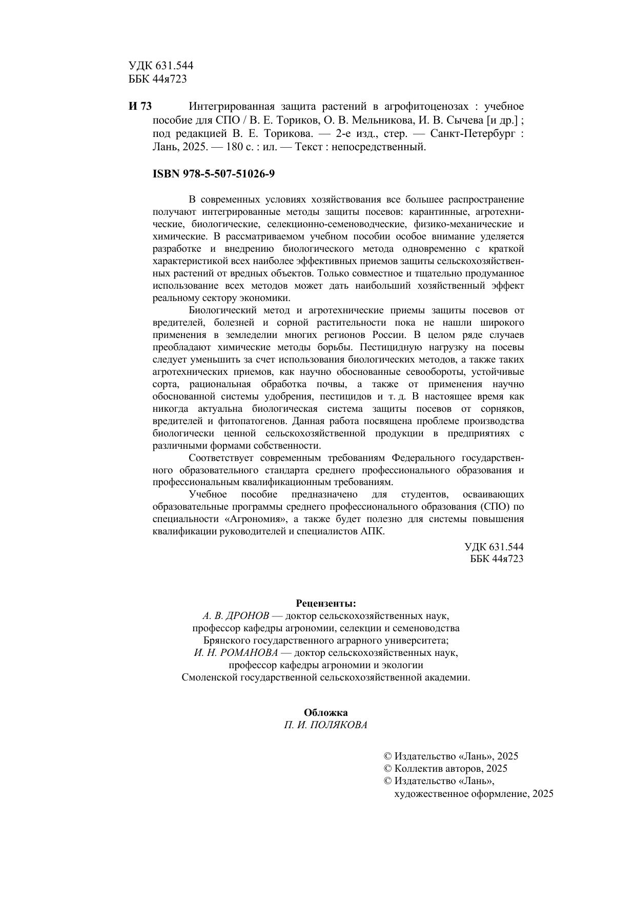 В современных условиях хозяйствования все большее распространение получают интегрированные методы защиты посевов: карантинные, агротехнические, биологические, селекционно-семеноводческие, физико-механические и химические. В рассматриваемом учебном пособии особое внимание уделяется разработке и внедрению биологического метода одновременно с краткой характеристикой всех наиболее эффективных приемов защиты сельскохозяйственных растений от вредных объектов. Только совместное и тщательно продуманное использование всех методов может дать наибольший хозяйственный эффект реальному сектору экономики. Биологический метод и агротехнические приемы защиты посевов от вредителей, болезней и сорной растительности пока не нашли широкого применения в земледелии многих регионов России. В целом ряде случаев преобладают химические методы борьбы. Пестицидную нагрузку на посевы следует уменьшить за счет использования биологических методов, а также таких агротехнических приемов, как научно обоснованные севообороты, устойчивые сорта, рациональная обработка почвы, а также от применения научно обоснованной системы удобрения, пестицидов и т. д. В настоящее время, как никогда актуальна биологическая система защиты посевов от сорняков, вредителей и фитопатогенов. Данная работа посвящена проблеме производства биологически ценной сельскохозяйственной продукции в предприятиях с различными формами собственности. Соответствует современным требованиям Федерального государственного образовательного стандарта среднего профессионального образования и профессиональным квалификационным требованиям. Учебное пособие предназначено для студентов, осваивающих образовательные программы среднего профессионального образования (СПО) по специальности «Агрономия», а также будет полезно для системы повышения квалификации руководителей и специалистов АПК.