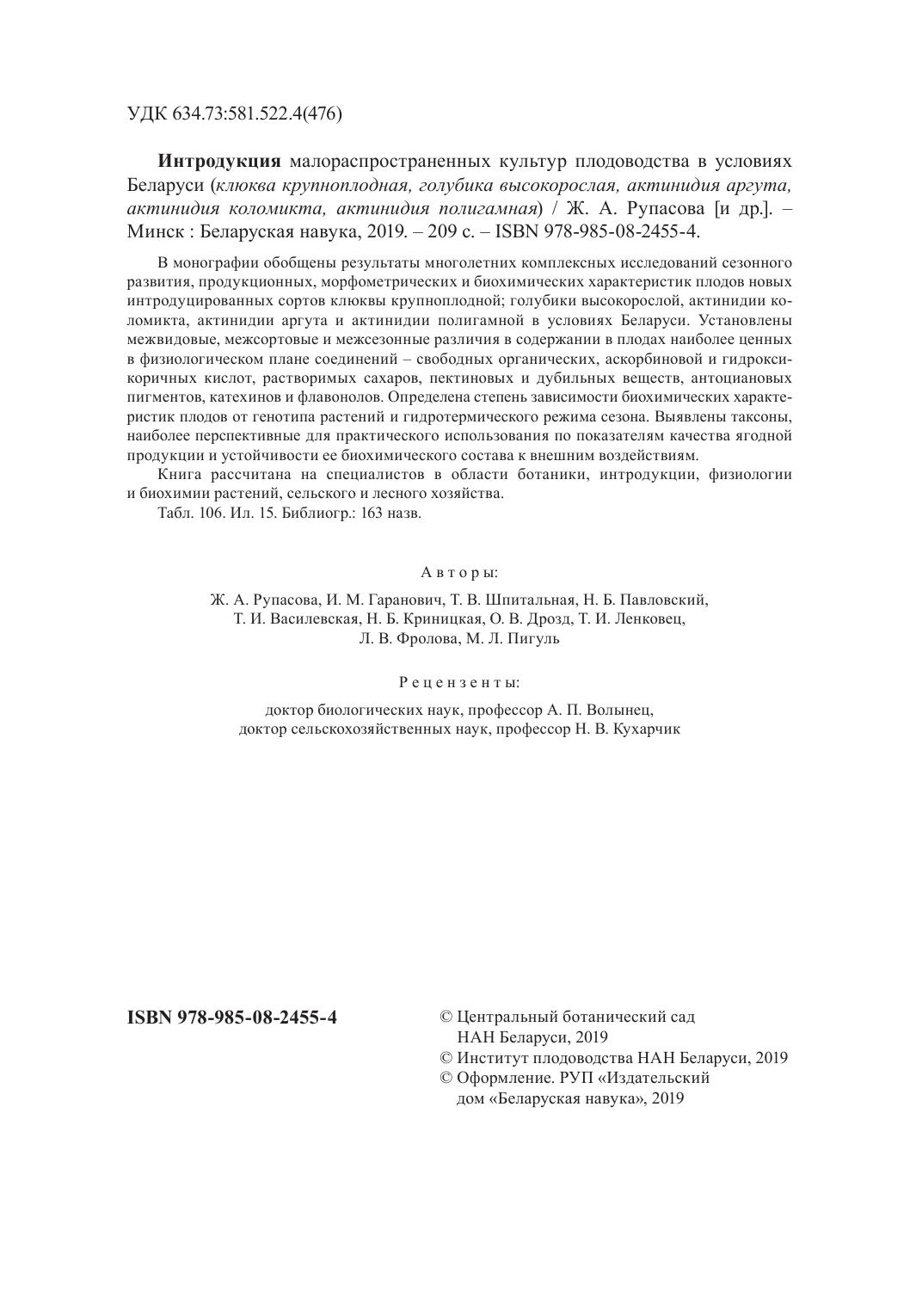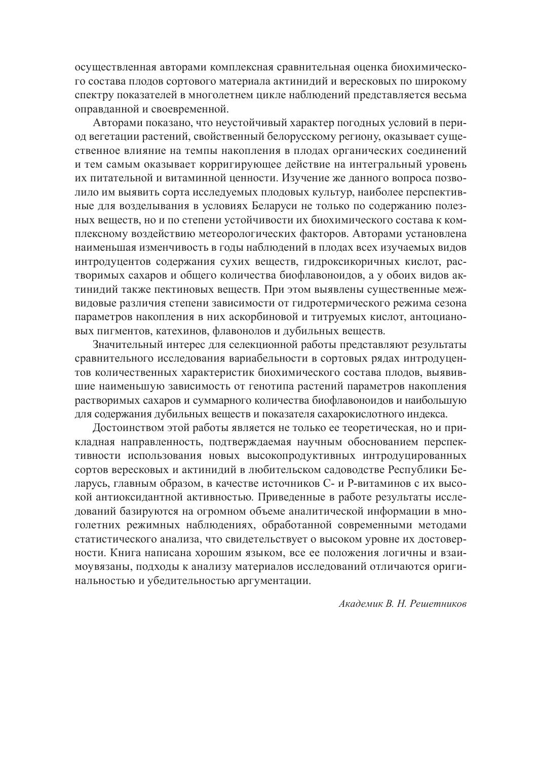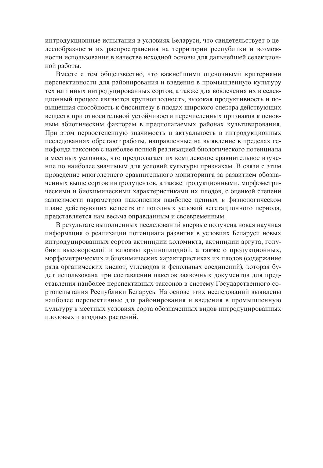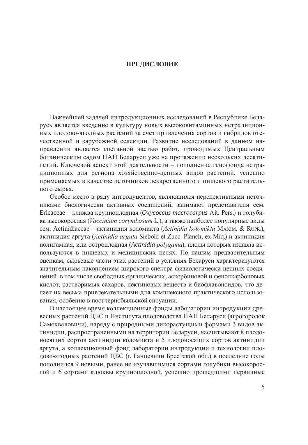 В монографии обобщены результаты многолетних комплексных исследований сезонного развития, продукционных, морфометрических и биохимических характеристик плодов новых интродуцированных сортов клюквы крупноплодной; голубики высокорослой, актинидии коломикта, актинидии аргута и актинидии полигамной в условиях Беларуси. Установлены межвидовые, межсортовые и межсезонные различия в содержании в плодах наиболее ценных в физиологическом плане соединений – свободных органических, аскорбиновой и гидроксикоричных кислот, растворимых сахаров, пектиновых и дубильных веществ, антоциановых пигментов, катехинов и флавонолов. Определена степень зависимости биохимических характеристик плодов от генотипа растений и гидротермического режима сезона. Выявлены таксоны, наиболее перспективные для практического использования по показателям качества ягодной продукции и устойчивости ее биохимического состава к внешним воздействиям. Книга рассчитана на специалистов в области ботаники, интродукции, физиологии и биохимии растений, сельского и лесного хозяйства.