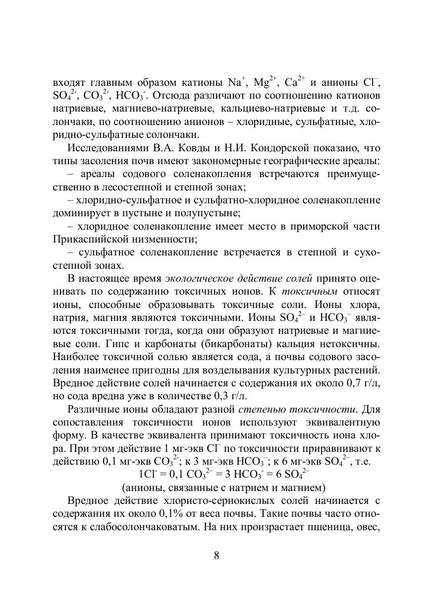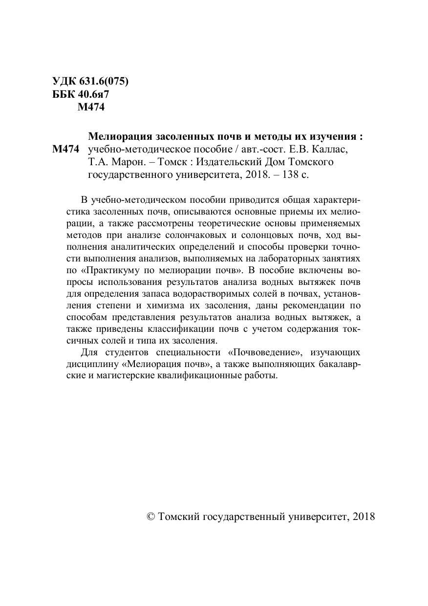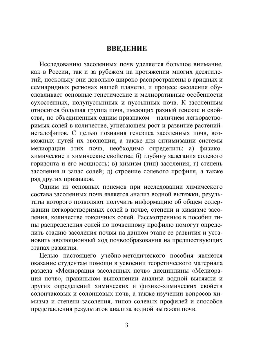 В учебно-методическом пособии приводится общая характеристика засоленных почв, описываются основные приемы их мелиорации, а также рассмотрены теоретические основы применяемых методов при анализе солончаковых и солонцовых почв, ход выполнения аналитических определений и способы проверки точности выполнения анализов, выполняемых на лабораторных занятиях по «Практикуму по мелиорации почв». В пособие включены вопросы использования результатов анализа водных вытяжек почв для определения запаса водорастворимых солей в почвах, установления степени и химизма их засоления, даны рекомендации по способам представления результатов анализа водных вытяжек, а также приведены классификации почв с учетом содержания токсичных солей и типа их засоления. Для студентов специальности «Почвоведение», изучающих дисциплину «Мелиорация почв», а также выполняющих бакалаврские и магистерские квалификационные работы.