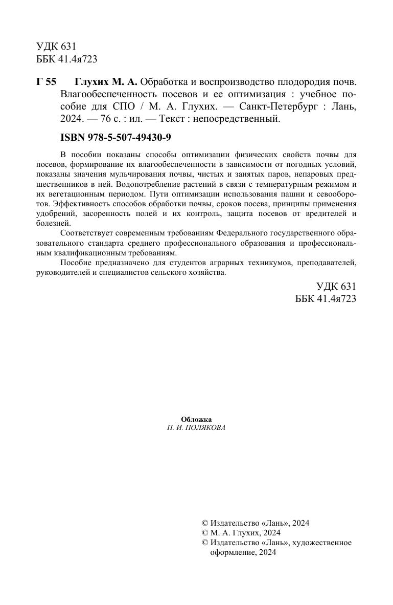 В пособии показаны способы оптимизации физических свойств почвы для посевов, формирование их влагообеспеченности в зависимости от погодных условий, показаны значения мульчирования почвы, чистых и занятых паров, непаровых предшественников в ней. Водопотребление растений в связи с температурным режимом и их вегетационным периодом. Пути оптимизации использования пашни и севооборотов. Эффективность способов обработки почвы, сроков посева, принципы применения удобрений, засоренность полей и их контроль, защита посевов от вредителей и болезней. Соответствует современным требованиям Федерального государственного образовательного стандарта среднего профессионального образования и профессиональным квалификационным требованиям. Пособие предназначено для студентов аграрных техникумов, преподавателей, руководителей и специалистов сельского хозяйства.