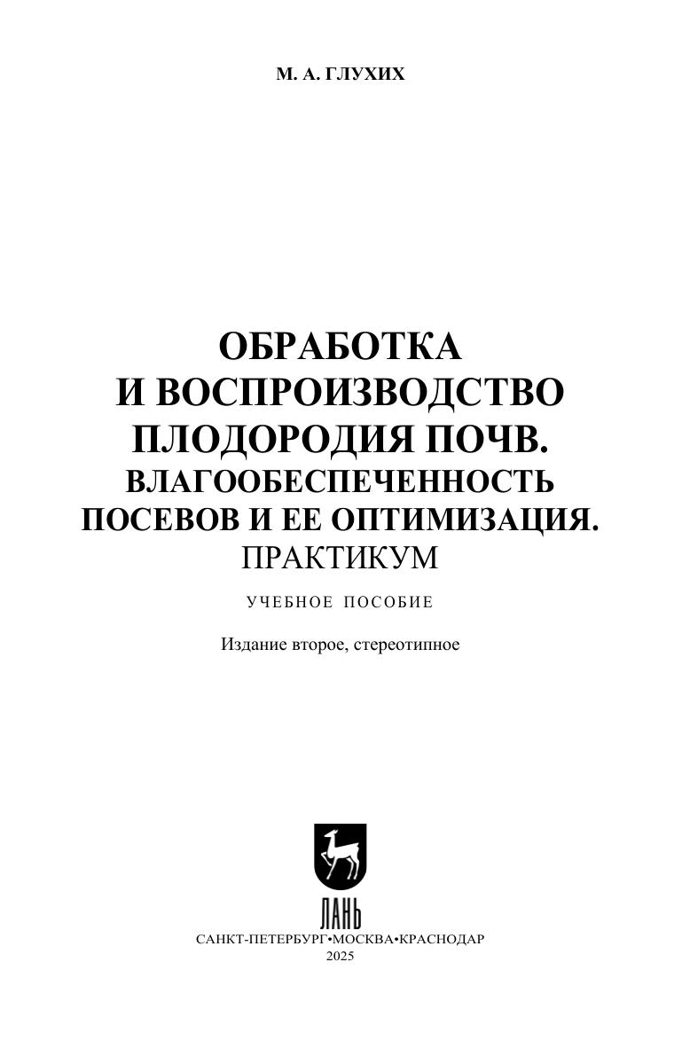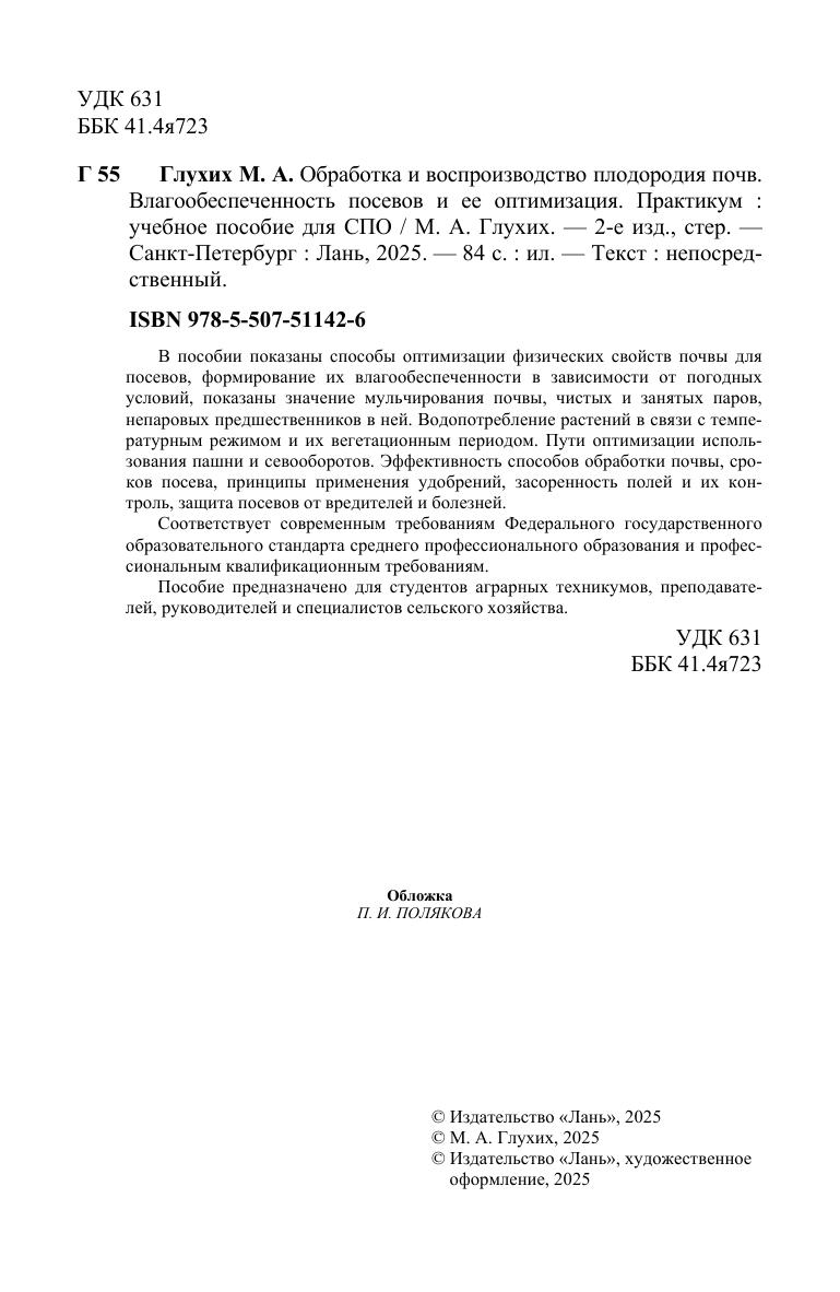 В пособии показаны способы оптимизации физических свойств почвы для посевов, формирование их влагообеспеченности в зависимости от погодных условий, показаны значение мульчирования почвы, чистых и занятых паров, непаровых предшественников в ней. Водопотребление растений в связи с температурным режимом и их вегетационным периодом. Пути оптимизации использования пашни и севооборотов. Эффективность способов обработки почвы, сроков посева, принципы применения удобрений, засоренность полей и их контроль, защита посевов от вредителей и болезней. Соответствует современным требованиям Федерального государственного образовательного стандарта среднего профессионального образования и профессиональным квалификационным требованиям. Пособие предназначено для студентов аграрных техникумов, преподавателей, руководителей и специалистов сельского хозяйства.