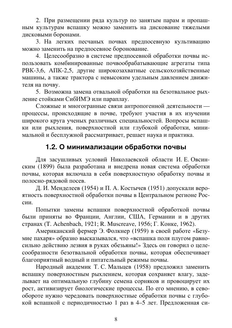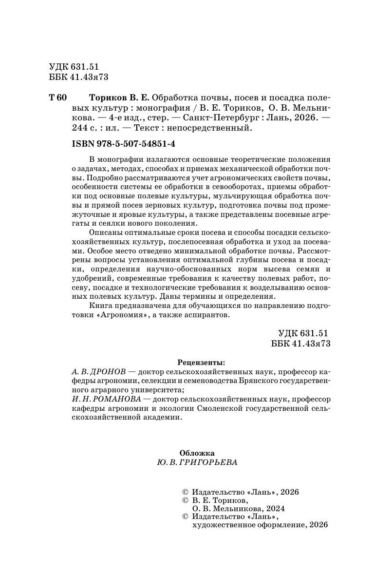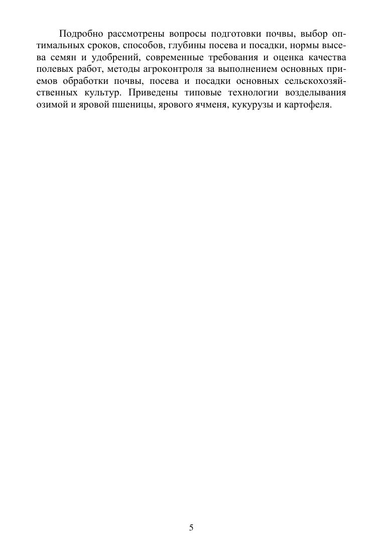 В монографии излагаются основные теоретические положения о задачах, методах, способах и приемах механической обработки почвы. Подробно рассматриваются учет агрономических свойств почвы, особенности системы обработки почвы в севооборотах, приемы обработка почвы под основные полевые культуры, мульчирующая обработка почвы и прямой посев зерновых культур, подготовка почвы под промежуточные и яровые культуры, а также представлены посевные агрегаты и сеялки нового поколения. Описаны оптимальные сроки посева и способы посадки сельскохозяйственных культур, послепосевная обработка и уход за посевами. Особое место отведено минимальной обработке почвы. Рассмотрены вопросы установления глубины посева и посадки, определения оптимальных норм высева семян и удобрений, современные требования к качеству полевых работ, посеву, посадке и технологических требований к возделыванию основных полевых культур. Даны термины и определения.