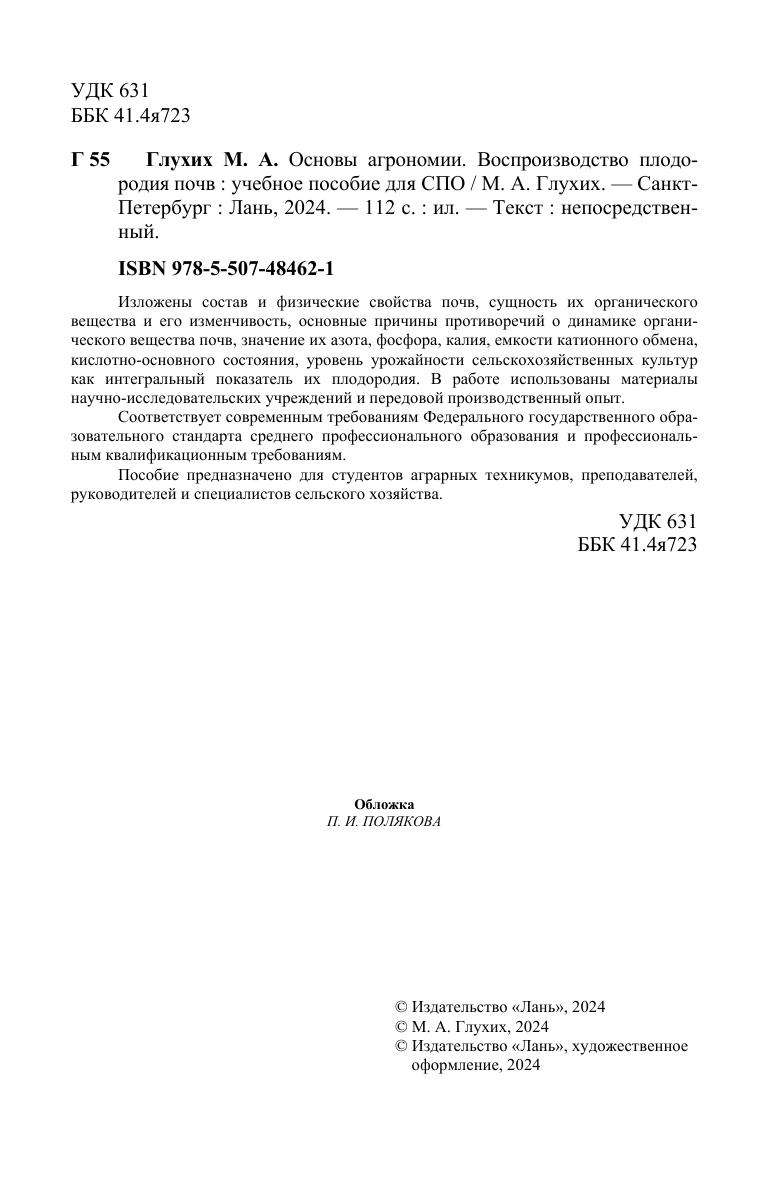 Изложены состав и физические свойства почв, сущность их органического вещества и его изменчивость, основные причины противоречий о динамике органического вещества почв, значение их азота, фосфора, калия, емкости катионного обмена, кислотно-основного состояния, уровень урожайности сельскохозяйственных культур как интегральный показатель их плодородия. В работе использованы материалы научно-исследовательских учреждений и передовой производственный опыт. Соответствует современным требованиям Федерального государственного образовательного стандарта среднего профессионального образования и профессиональным квалификационным требованиям. Пособие предназначено для студентов аграрных техникумов, преподавателей, руководителей и специалистов сельского хозяйства.