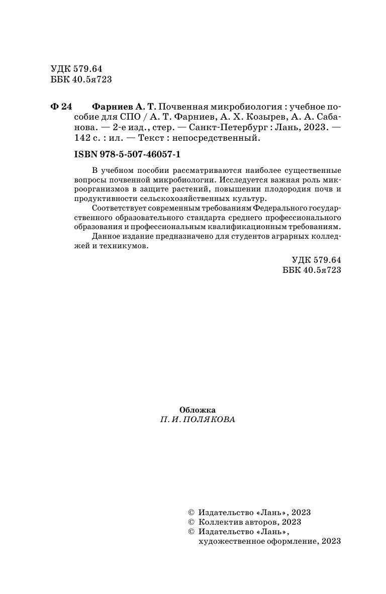 В учебном пособии рассматриваются наиболее существенные вопросы почвенной микробиологии. Исследуется важная роль микроорганизмов в защите растений, повышении плодородии почв и продуктивности сельскохозяйственных культур. Соответствует современным требованиям Федерального государственного образовательного стандарта среднего профессионального образования и профессиональным квалификационным требованиям. Данное издание предназначено для студентов аграрных колледжей и техникумов.