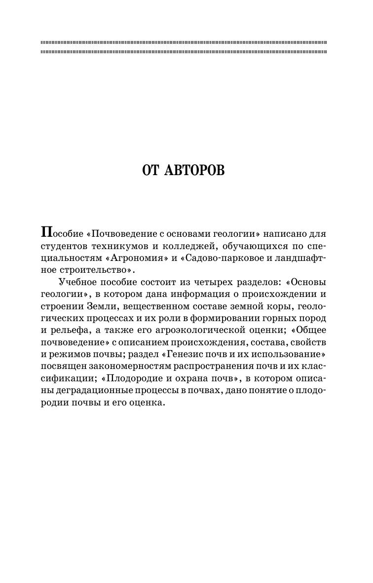 В учебном пособии изложены основы геологии как единая составная часть курса почвоведения. Описана общая схема почвообразовательного процесса, состав, свойства, режимы почв и их влияние на формирование ее плодородия. Показана потребность сельскохозяйственных культур к почвенным условиям. Охарактеризованы почвы различных природных зон и их сельскохозяйственное использование. Отражены деградационные процессы в почвах, вопросы повышения плодородия почв и их качественной оценки. Предназначено для студентов колледжей и техникумов, обучающихся по специальности «Агрономия» и «Садово-парковое и ландшафтное строительство».