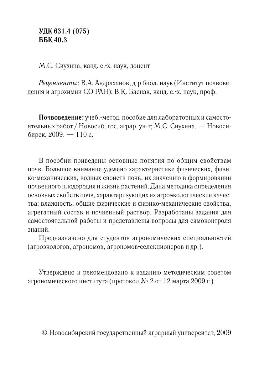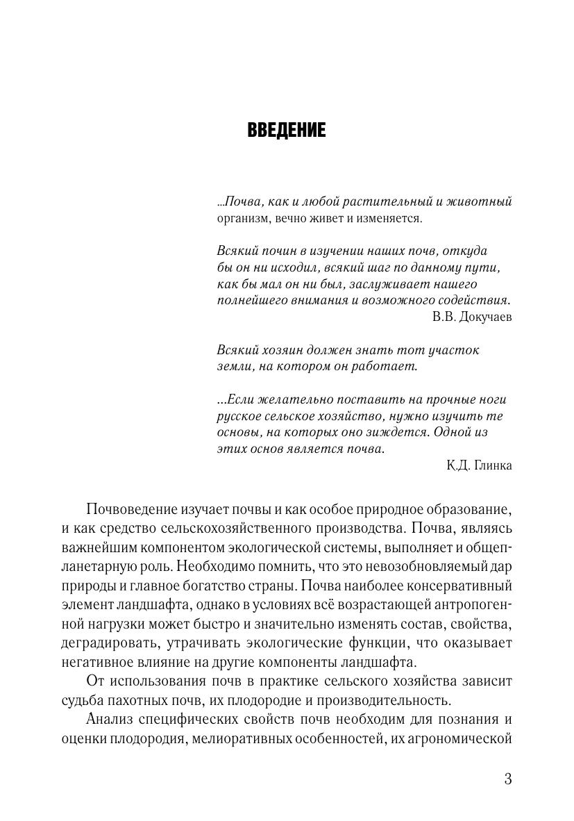 В пособии приведены основные понятия по общим свойствам почв. Большое внимание уделено характеристике физических, физико-механических, водных свойств почв, их значению в формировании почвенного плодородия и жизни растений. Дана методика определения основных свойств почв, характеризующих их агроэкологические качества: влажность, общие физические и физико-механические свойства, агрегатный состав и почвенный раствор. Разработаны задания для самостоятельной работы и представлены вопросы для самоконтроля знаний. Предназначено для студентов агрономических специальностей (агроэкологов, агрономов, агрономов-селекционеров и др.).