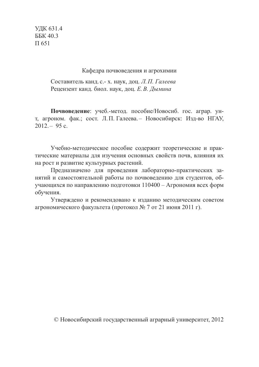 Учебно-методическое пособие содержит теоретические и практические материалы для изучения основных свойств почв, влияния их на рост и развитие культурных растений. Предназначено для проведения лабораторно-практических занятий и самостоятельной работы по почвоведению для студентов, обучающихся по направлению подготовки 110400 – Агрономия всех форм обучения.