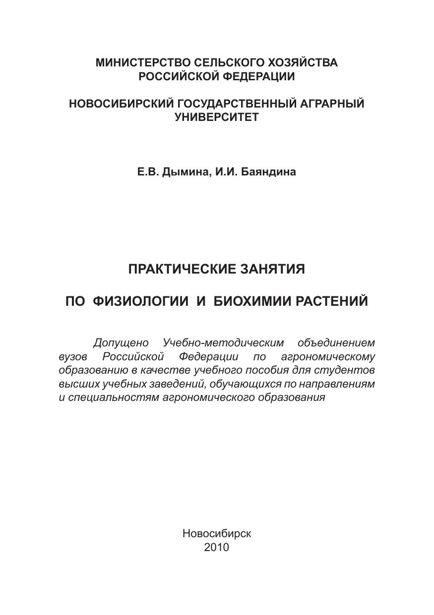 Учебное пособие содержит краткие теоретические пояснения к изучаемым темам курса биохимии и физиологии сельскохозяйственных растений, лабораторные рабо-ты, которые позволяют составить представление о фи-зиологических процессах в растительном организме и методах их исследований, а также вопросы для подготовки к сдаче тестов, зачета и экзамена. Предназначено для студентов сельскохозяйствен-ных вузов, обучающихся по направлениям: «Агрохимия и агропочвоведение», «Агрономия», «Садоводство»