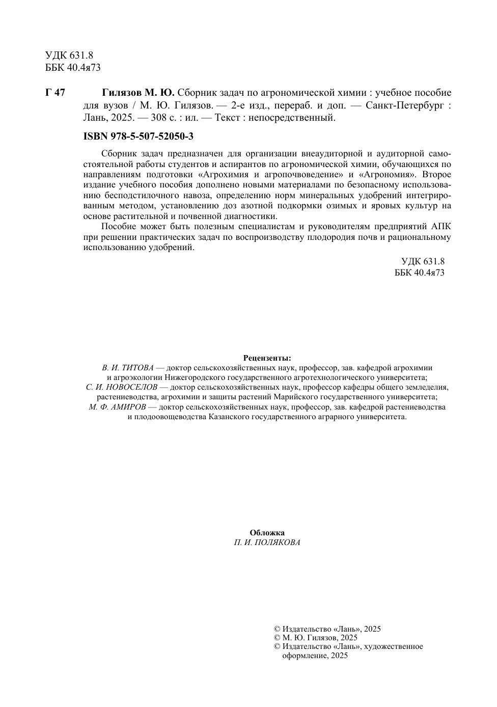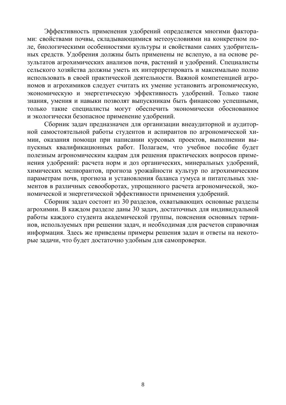 Сборник задач предназначен для организации внеаудиторной и аудиторной самостоятельной работы студентов и аспирантов по агрономической химии, обучающихся по направлениям подготовки «Агрохимия и агропочвоведение» и «Агрономия». Второе издание учебного пособия дополнено новыми материалами по безопасному использованию бесподстилочного навоза, определению норм минеральных удобрений интегрированным методом, установлению доз азотной подкормки озимых и яровых культур на основе растительной и почвенной диагностики. Пособие может быть полезным специалистам и руководителям предприятий АПК при решении практических задач по воспроизводству плодородия почв и рациональному использованию удобрений.