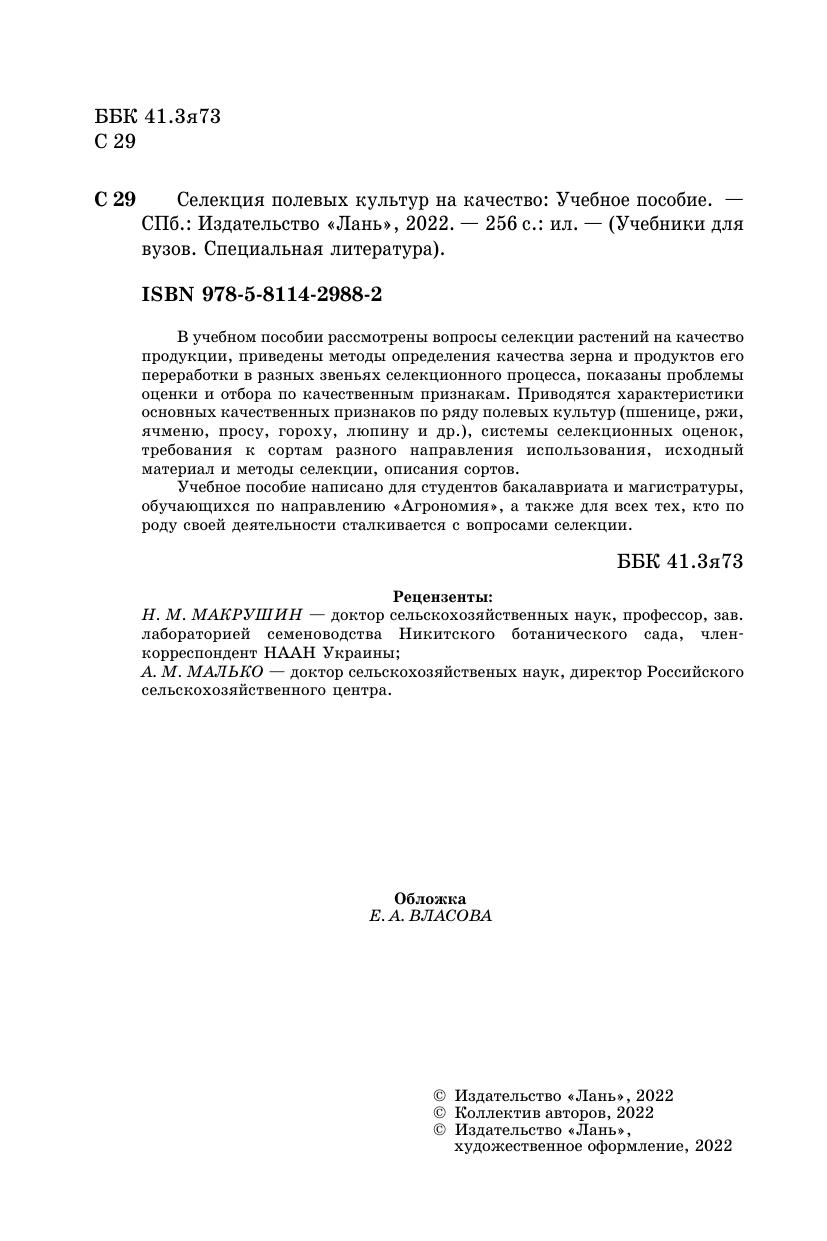 В учебном пособии рассмотрены вопросы селекции растений на качество продукции, приведены методы определения качества зерна и продуктов его переработки в разных звеньях селекционного процесса, показаны проблемы оценки и отбора по качественным признакам. Приводятся характеристики основных качественных признаков по ряду полевых культур (пшенице, ржи, ячменю, просу, гороху, люпину и др.), системы селекционных оценок, требования к сортам разного направления использования, исходный материал и методы селекции, описания сортов. Учебное пособие написано для студентов бакалавриата и магистратуры, обучающихся по направлению «Агрономия», а также для всех тех, кто по роду своей деятельности сталкивается с вопросами селекции.
