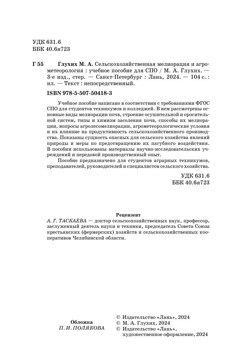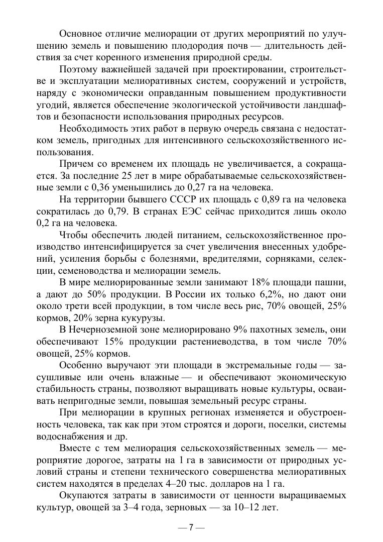 Учебное пособие написано в соответствии с требованиями ФГОС СПО для студентов техникумов и колледжей. В нем рассмотрены основные виды мелиорации почв, строение осушительной и оросительной систем, типы и химизм засоления почв, способы их мелиорации, вопросы агролесомелиорации, агрометеорологические условия и их влияние на продуктивность сельскохозяйственного производства. Показаны сущность опасных для сельского хозяйства явлений природы и меры по предотвращению их пагубного воздействия. В пособии использованы материалы научно-исследовательских учреждений и передовой производственный опыт. Пособие предназначено для студентов аграрных техникумов, преподавателей, руководителей и специалистов сельского хозяйства.