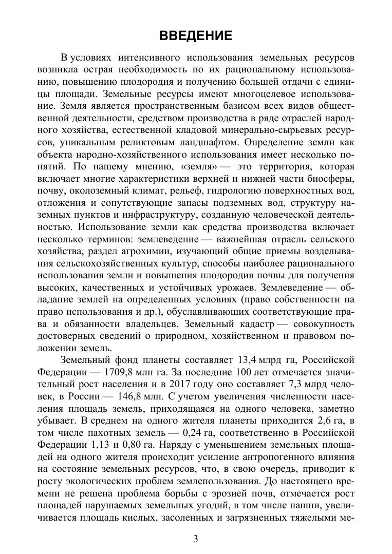 В учебном пособии приведены сведения о земельных ресурсах Мира, Российской Фе-дерации и их состоянии. Отмечено ухудшение плодородия земель в связи с их деградацией. Показано, что усиление антропогенного воздействия на земельные ресур-сы увеличивает площади земель подверженных эрозии, закислению, дегумификации, засолению, потере основного компонента плодородия – гумуса. Кроме того, отмечается увеличение изъятия земельных площадей, в том числе и пашни для нужд промышлен-ности, строительства, складирования отходов производства и быта, прокладки трубо-проводов различного назначения и др. Одним из приёмов улучшения их состояния, по-вышения плодородия земель является использование различных видов мелиорации. Отмечена роль государственного кадастра в оценке земель и землеустройства, что иг-рает значительную роль в повышении плодородия сельскохозяйственных земель и их охране. Предлагается рад направления в рациональном использовании земель, связан-ные с рекультивацией земли, воспроизводством их плодородия. Предлагается перехо-дить к воспроизводству плодородия почв сельскохозяйственного назначения путём внедрения альтернативного земледелия. Указаны законодательные акты по охране зе-мель и их рациональному использованию.