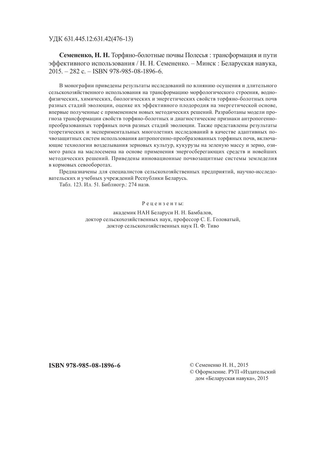 В монографии приведены результаты исследований по влиянию осушения и длительного сельскохозяйственного использования на трансформацию морфологического строения, воднофизических, химических, биологических и энергетических свойств торфяно-болотных почв разных стадий эволюции, оценке их эффективного плодородия на энергетической основе, впервые полученные с применением новых методических решений. Разработаны модели прогноза трансформации свойств торфяно-болотных и диагностические признаки антропогенно-преобразованных торфяных почв разных стадий эволюции. Также представлены результаты теоретических и экспериментальных многолетних исследований в качестве адаптивных почвозащитных систем использования антропогенно-преобразованных торфяных почв, включающие технологии возделывания зерновых культур, кукурузы на зеленую массу и зерно, озимого рапса на маслосемена на основе применения энергосберегающих средств и новейших методических решений. Приведены инновационные почвозащитные системы земледелия в кормовых севооборотах. Предназначены для специалистов сельскохозяйственных предприятий, научно-исследовательских и учебных учреждений Республики Беларусь.