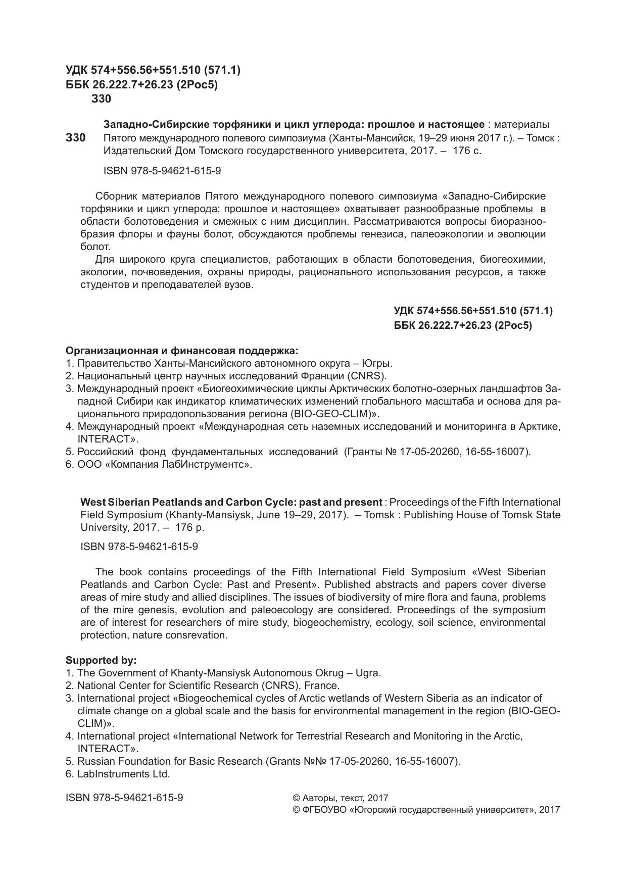 Сборник материалов Пятого международного полевого симпозиума «Западно-Сибирские торфяники и цикл углерода: прошлое и настоящее» охватывает разнообразные проблемы в области болотоведения и смежных с ним дисциплин. Рассматриваются вопросы биоразнообразия флоры и фауны болот, обсуждаются проблемы генезиса, палеоэкологии и эволюции болот. Для широкого круга специалистов, работающих в области болотоведения, биогеохимии, экологии, почвоведения, охраны природы, рационального использования ресурсов, а также студентов и преподавателей вузов.